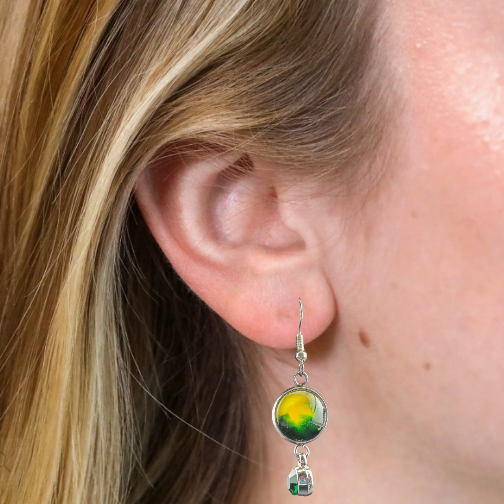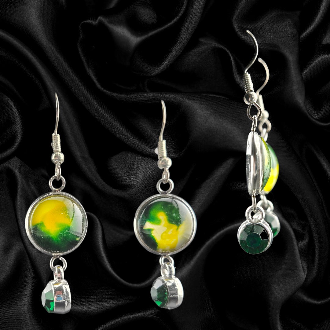 Handmade stainless steel earrings with a 12mm abstract glass cabochon paired with a faceted green stone charm for a bold, earthy accent.