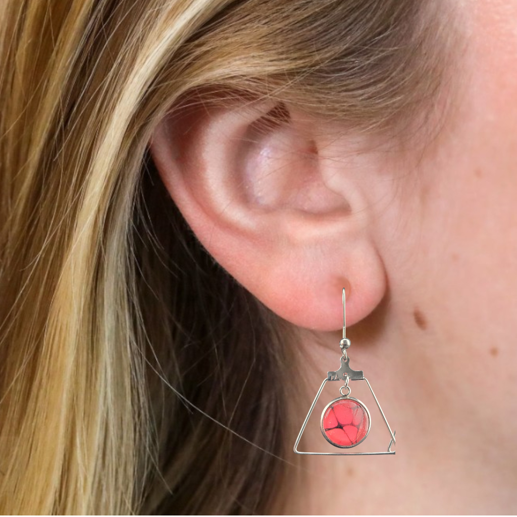 Handmade hanging earrings featuring a 12mm abstract art glass cabochon suspended inside a minimalist silver-tone triangle frame. Each piece showcases unique blended tones with organic line detailing. Lightweight and comfortable for everyday wear.