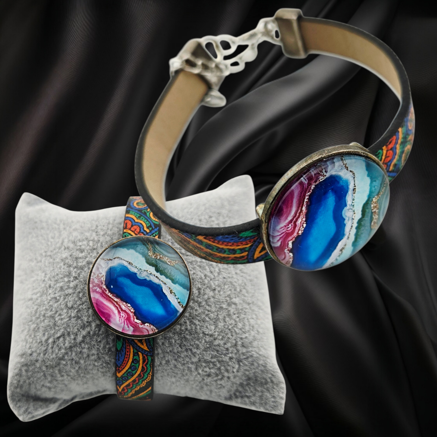 This adjustable leather bracelet blue pink green is handmade with care and a playful, boho-inspired spirit. Each piece is crafted to feel whimsical and artsy. Only one available. 6.7"-8.3" length.