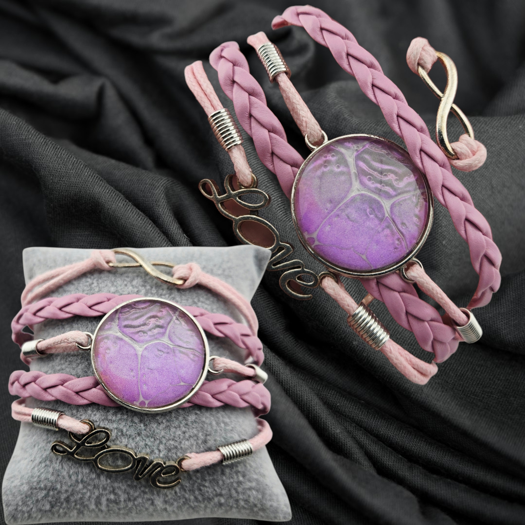 This adjustable multi-band pink leather "love" bracelet is handmade with care and a playful, boho-inspired spirit. Each piece is crafted to feel whimsical and artsy. Only one available. 7.5"-9.25" length.