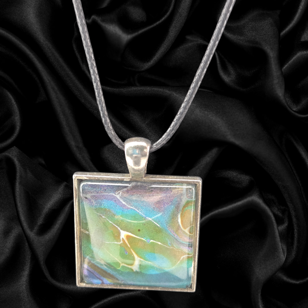 One of a kind square pendant necklace featuring flowing aurora-inspired colors in soft blues, greens, and hints of gold. Set in a silver-toned frame and paired with a 1.2mm silver snake chain (electroplated brass). Pendant measures 1 inch square.