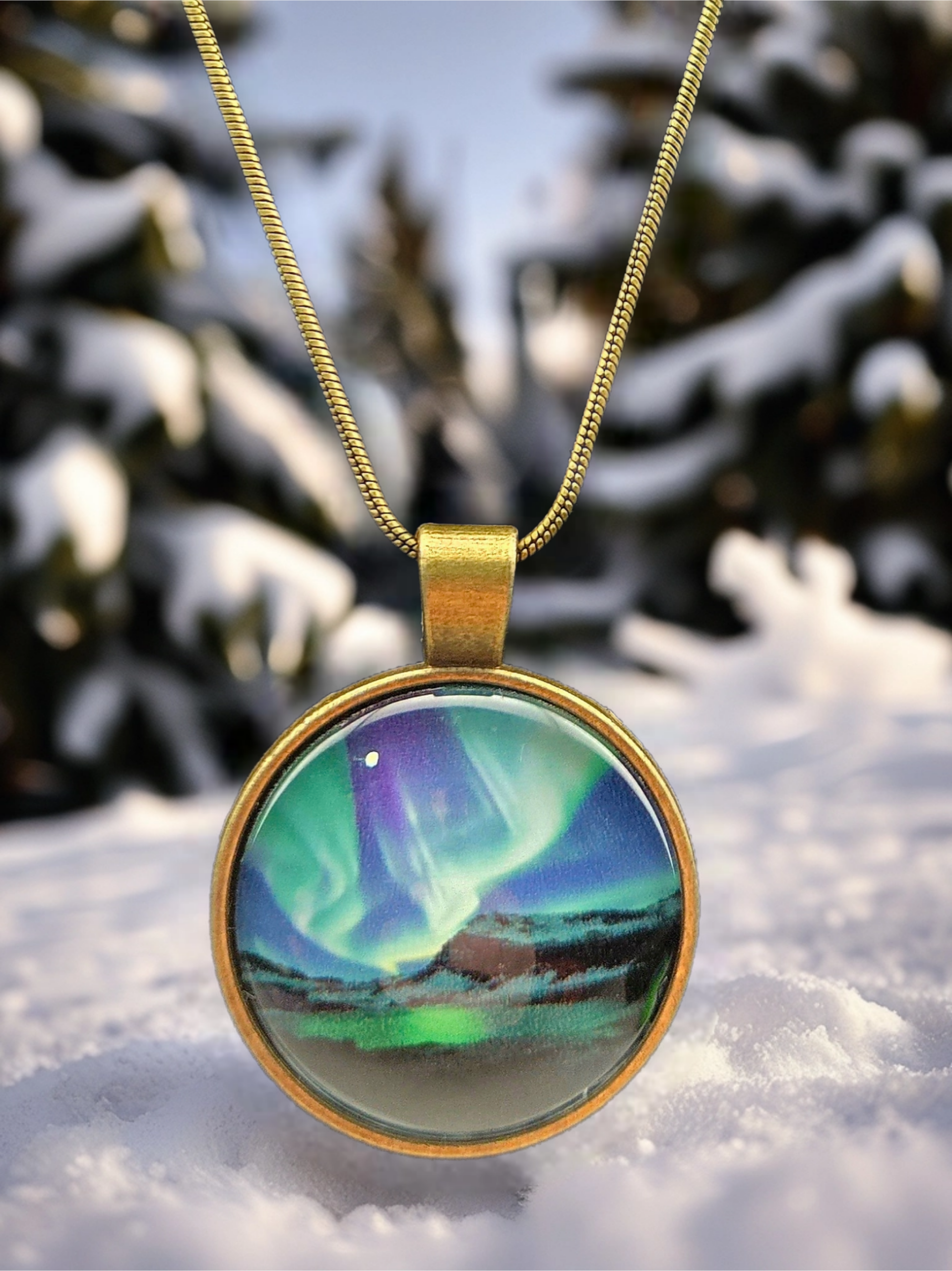 This 1-inch round pendant features a vivid aurora borealis scene, with flowing green and teal northern lights dancing across a twilight sky above a snowy landscape. Dark evergreen trees frame the horizon, creating a serene winter night atmosphere beneath the glowing lights. The image is sealed beneath a smooth glass cabochon and set in a gold-toned bezel, paired with a matching gold-toned chain.