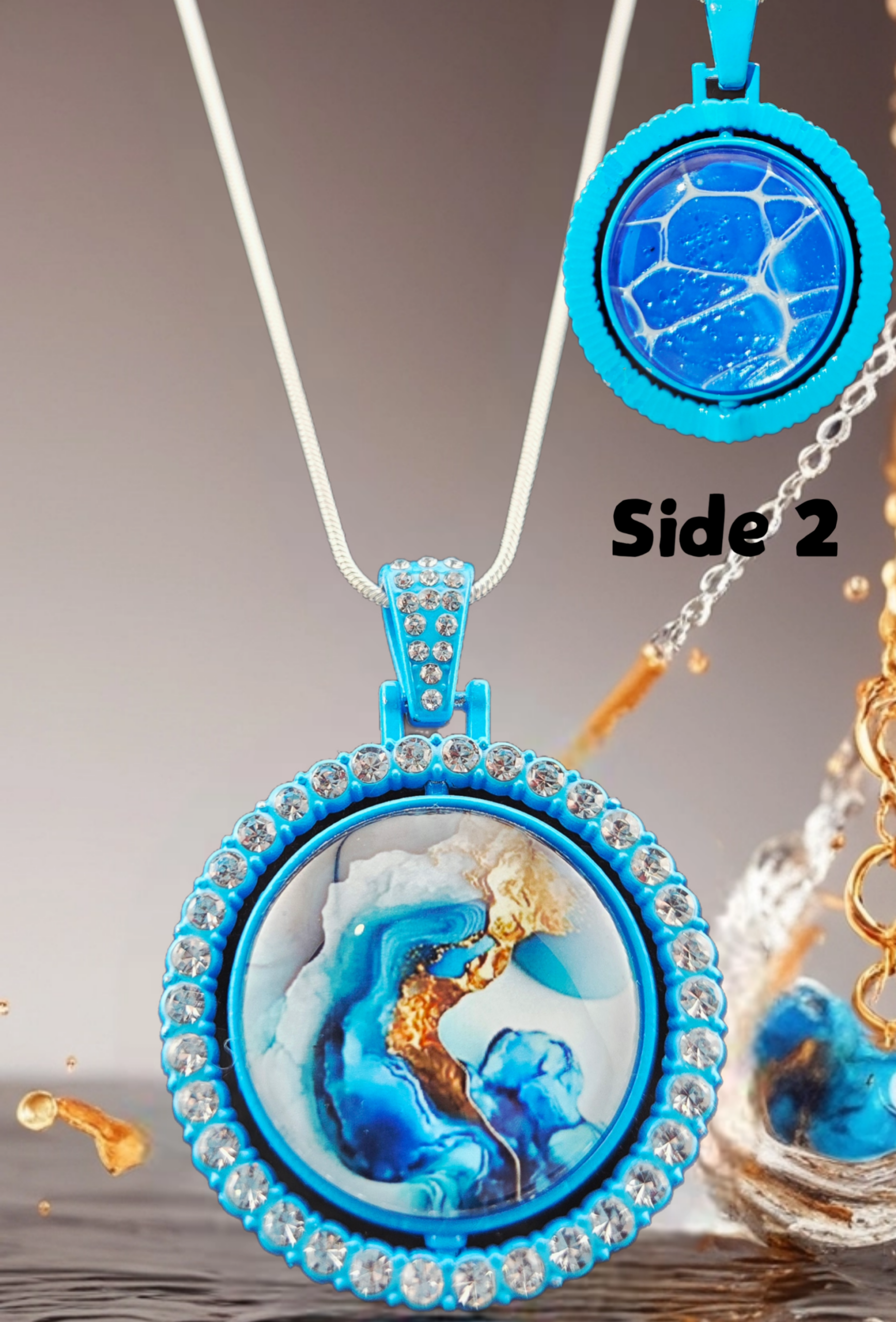 This elegant double-sided pendant necklace features two distinct abstract designs displayed in a rotating tray, allowing you to change the look with a simple turn. Each side is protected by a smooth glass cabochon that enhances color depth and detail. The round pendant is framed by a rhinestone-accented bezel and hangs from a sleek silver-tone snake chain.