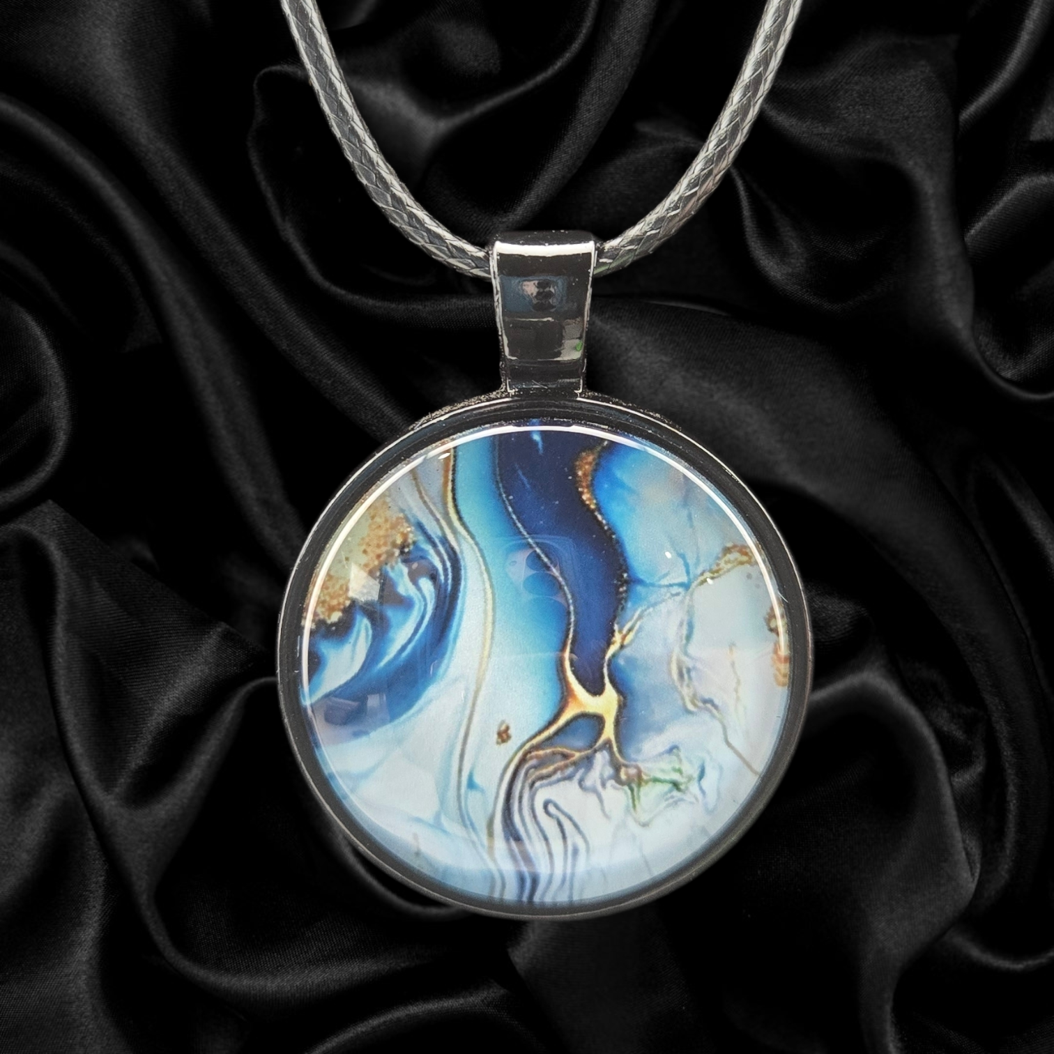 This abstract marble-style artwork is preserved in a 1-inch round glass charm and paired with a 1.2mm silver snake chain made from electroplated brass. Flowing blues and gold accents create a modern, artistic statement.
