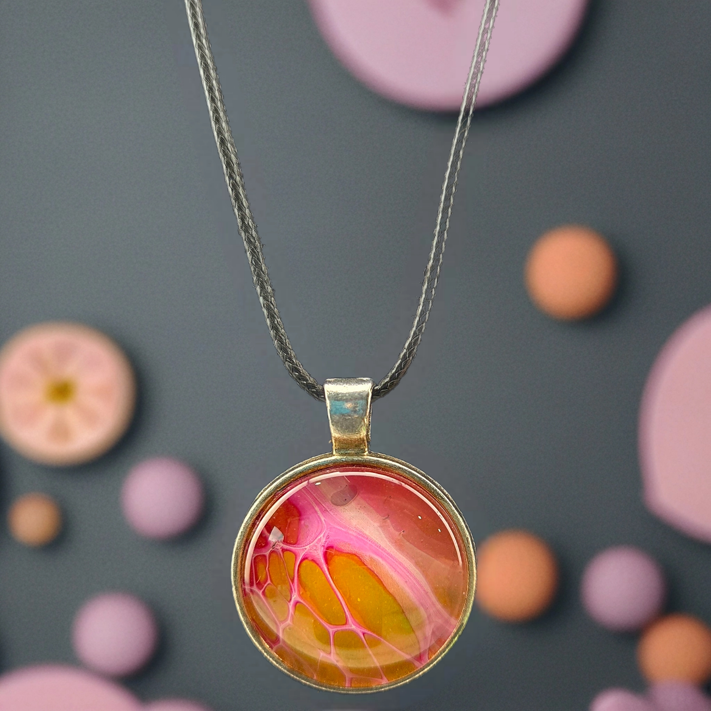 A soft marble-inspired design in blush, rose, and golden tones sealed beneath a 1-inch round glass charm. Finished with a 1.2mm gold snake chain made from electroplated brass for a warm, polished look.