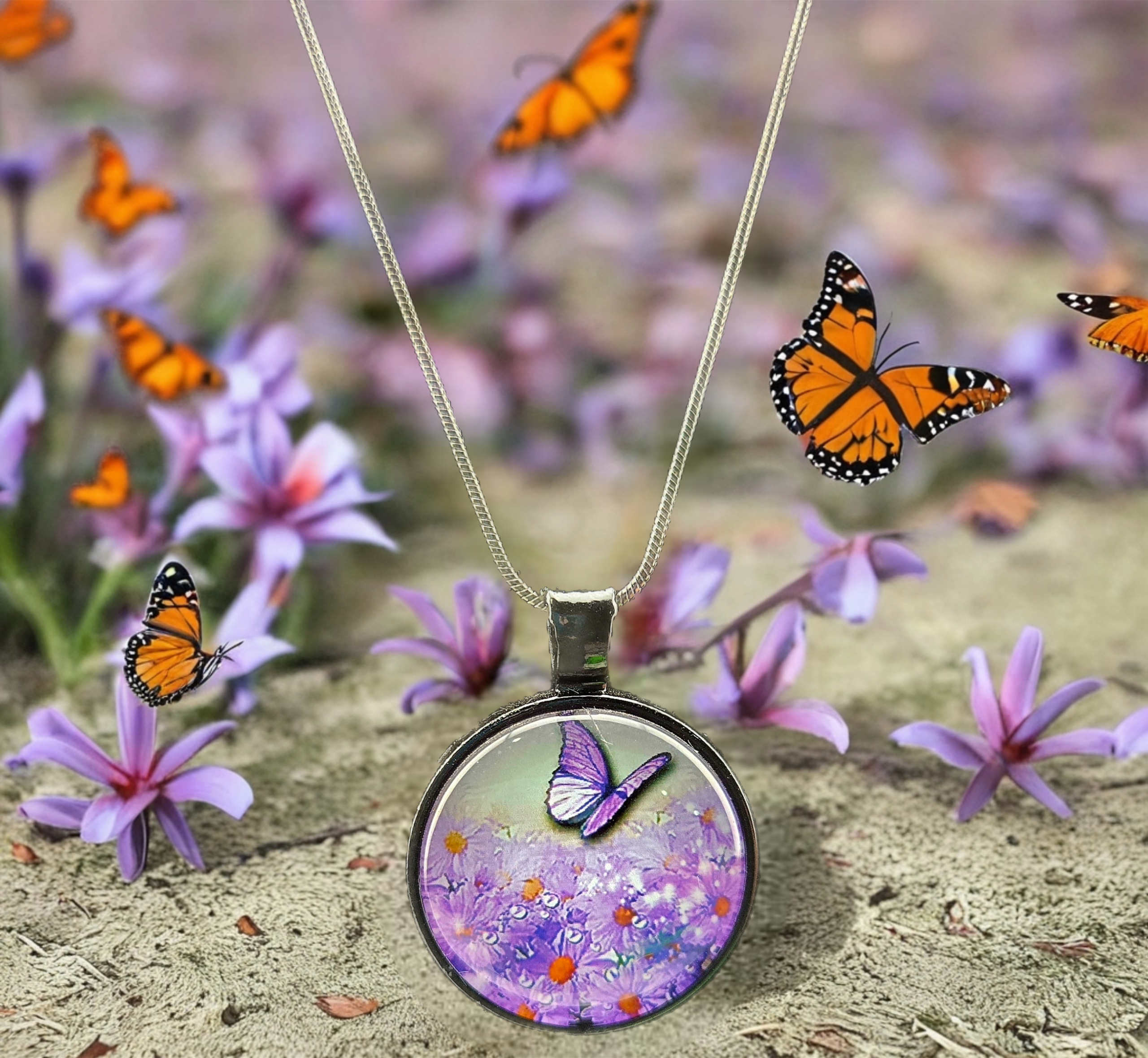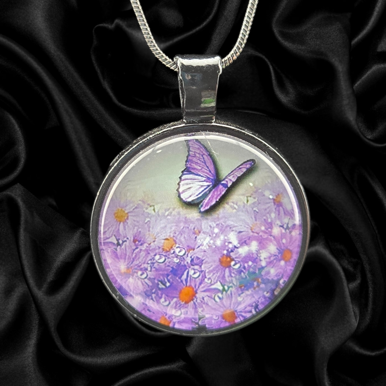 Handmade necklace featuring a purple floral meadow and butterfly design in a 1" round charm. Necklace includes a 1.2mm silver snake chain made from electroplated brass.