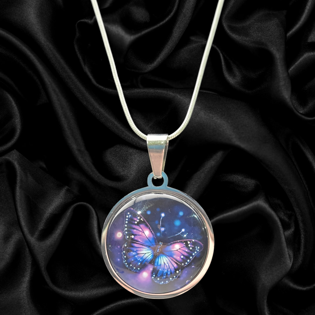 One of a kind round pendant necklace featuring a luminous butterfly design against a deep cosmic background. Set in a silver-toned frame and finished with a 1.2mm silver snake chain (electroplated brass). Pendant measures 1 inch round.