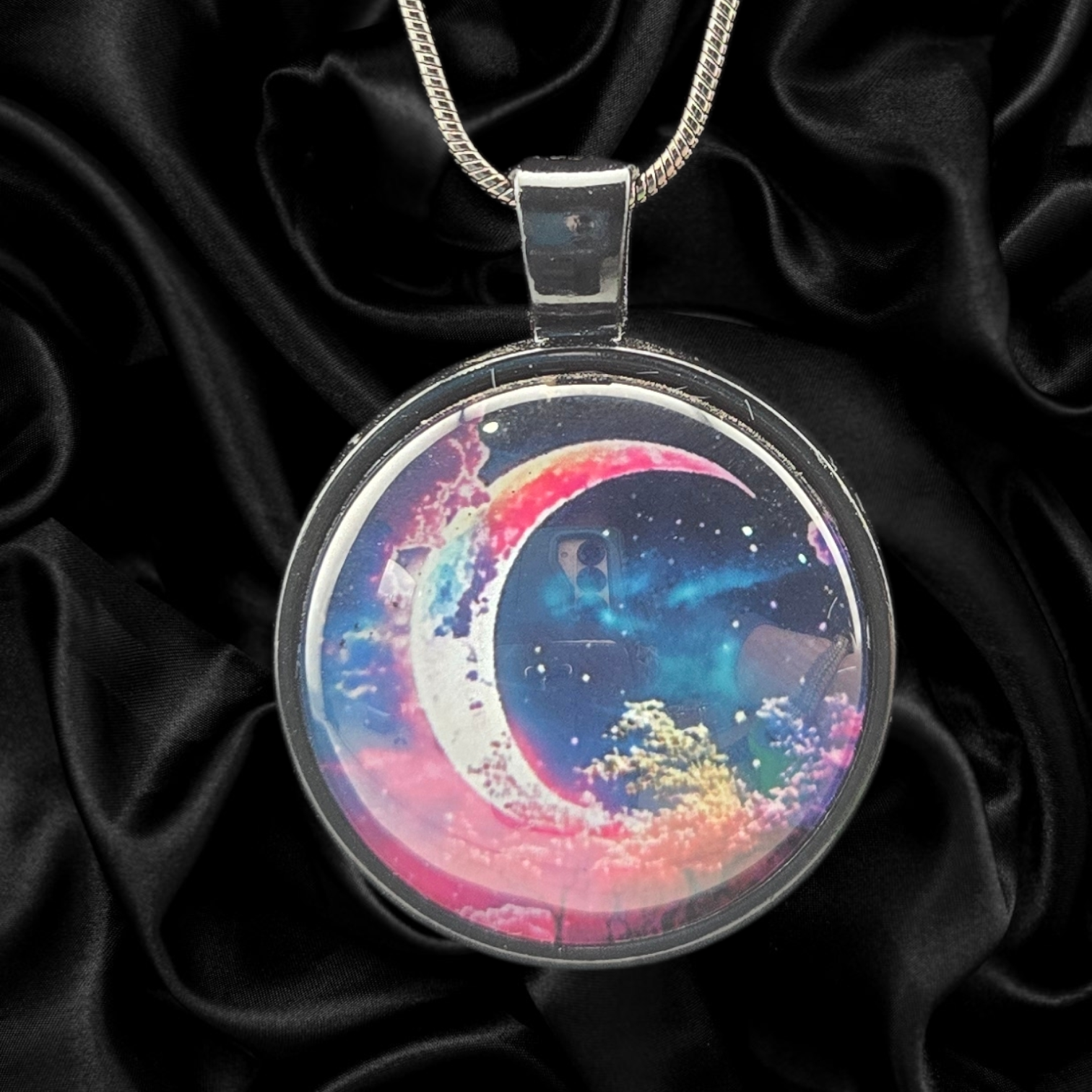 Handmade necklace featuring a cosmic crescent moon scene in a 1" round black charm. Necklace includes a 1.2mm blacksnake chain made from electroplated brass.