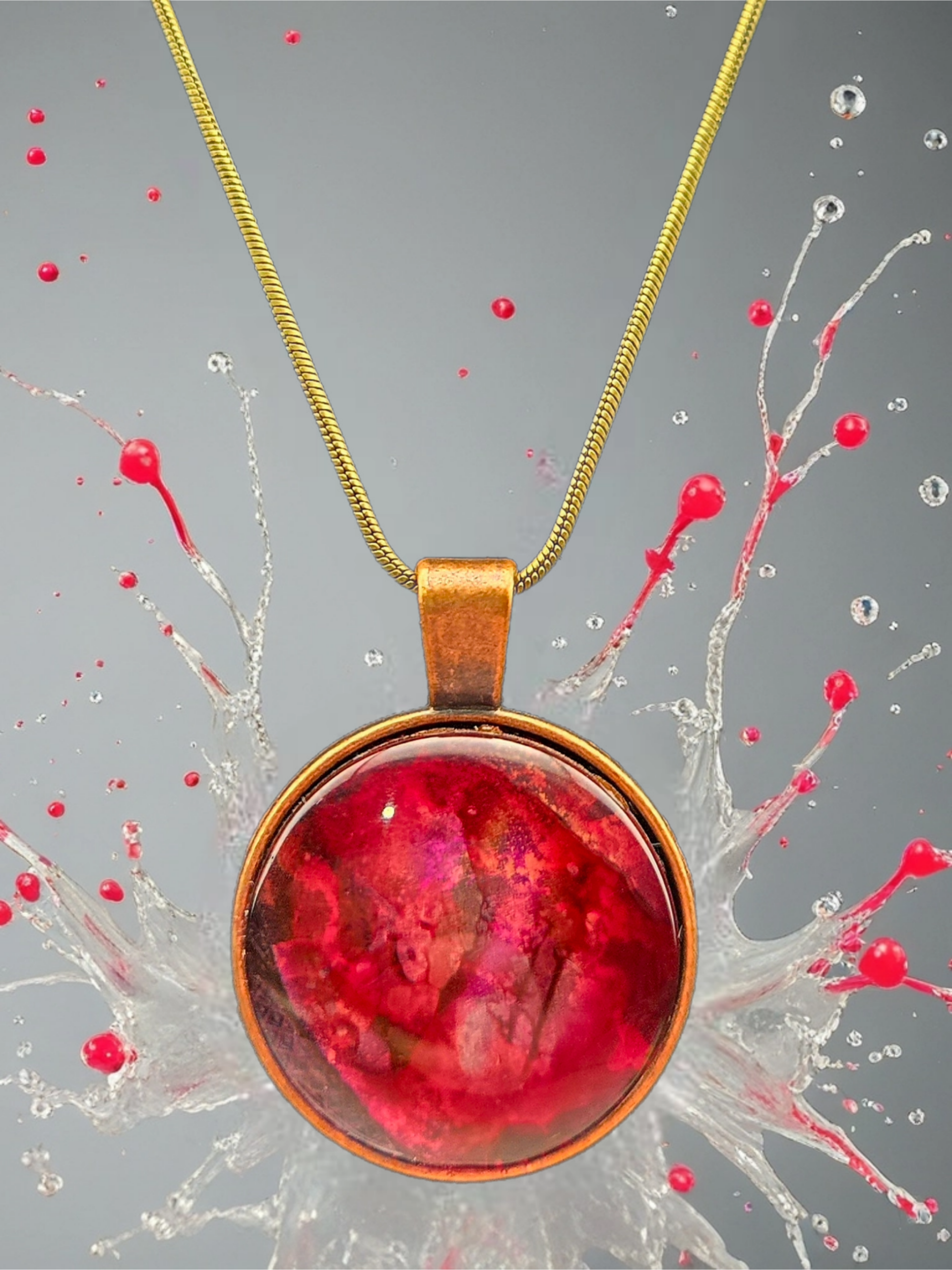 A bold, fiery cabochon featuring layered reds—crimson, ruby, and magenta—swirled in a glossy, marbled finish. This 1" round pendant is one-sided and hangs from a 1.2mm gold snake chain (electroplated brass).