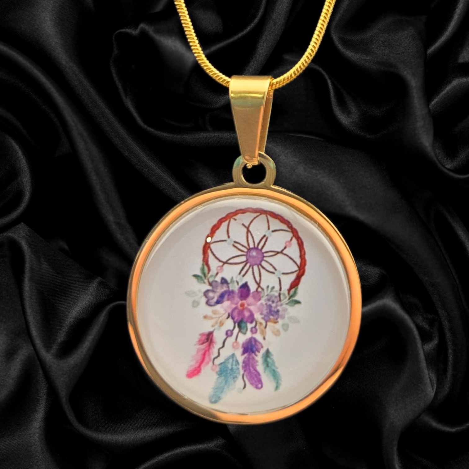 This 1" round necklace features a delicate dreamcatcher design adorned with soft florals and flowing feathers, captured beneath a smooth, glossy cabochon. The warm gold-tone setting complements the gentle color palette, creating a piece that feels both whimsical and elegant.