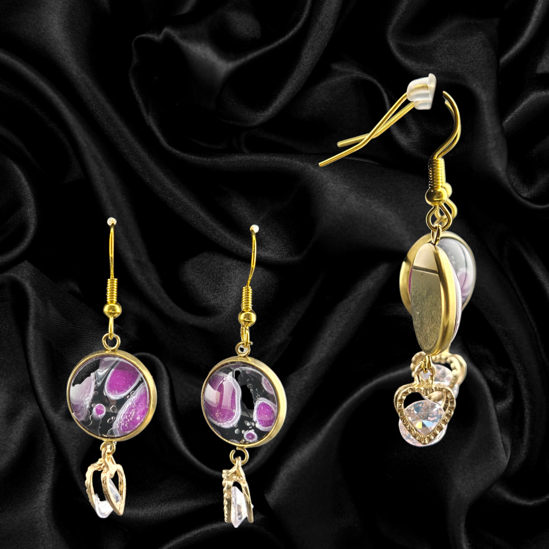 A rich purple fluid art design fills the 12mm cabochon, paired with a gold diamond heart charm for a bold yet romantic look. Gold-plated stainless steel findings ensure durability, shine, and comfortable wear. No two pairs are ever the same.