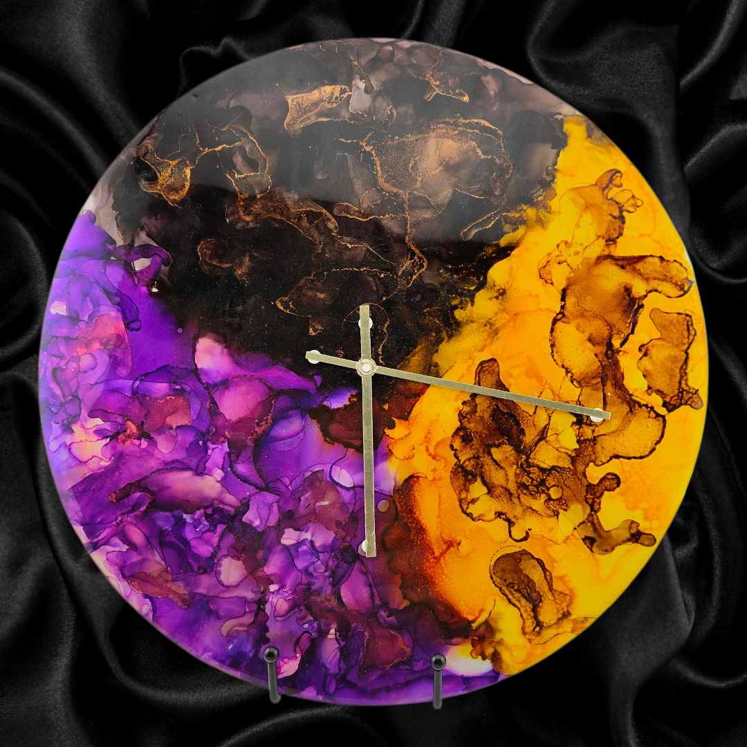 Design details vary — this piece features deep purples and golds that collide with dramatic contrast and molten texture.