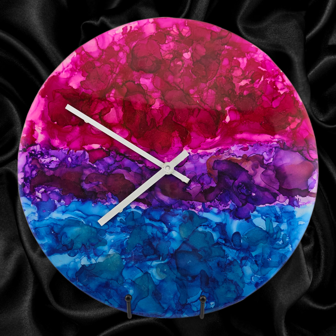 Be the first to review “Handpainted Vinyl Record Wall Clock – 12″ – Magenta Storm”