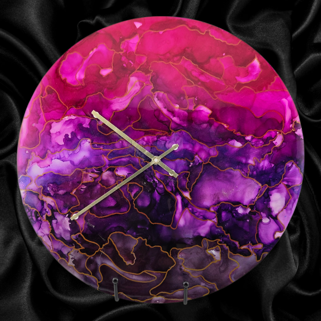 Design details vary — this piece features deep purples and magentas traced with gold-like lines and fluid motion.