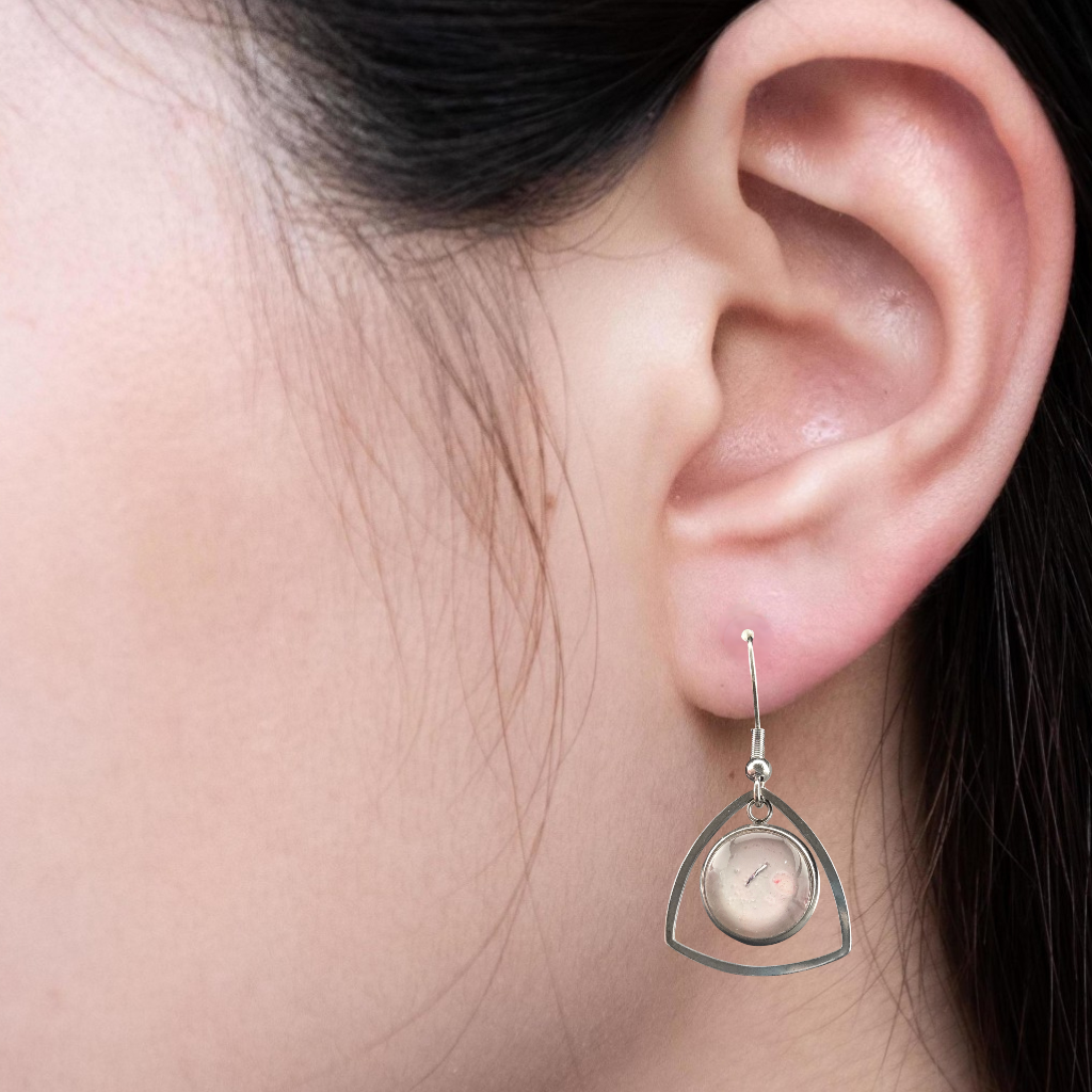 Stainless steel hanging earrings featuring a 12mm glass-domed blush design with subtle translucent details, suspended inside a diamond-shaped frame. Completed with silver-tone fishhook ear wires.