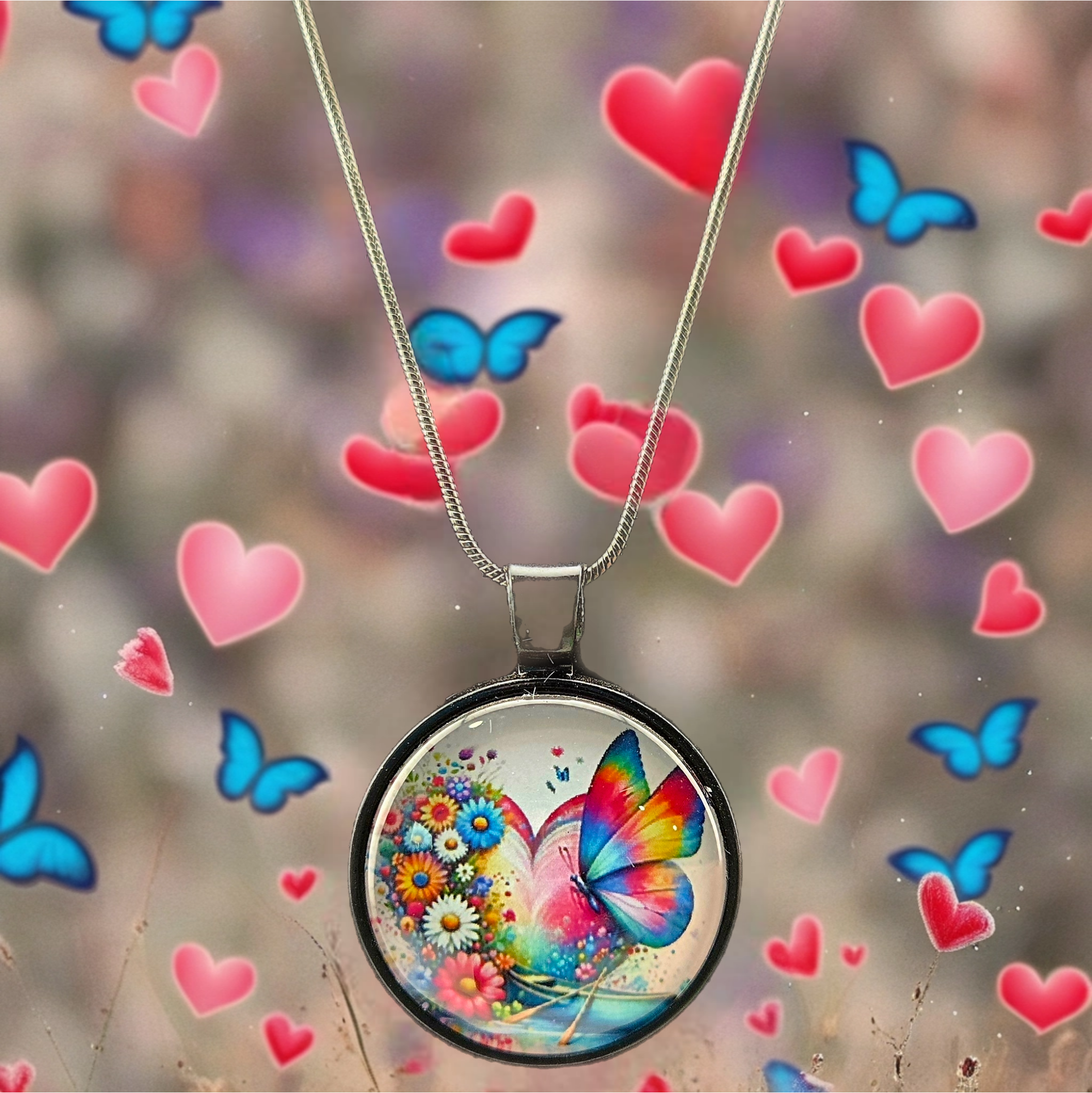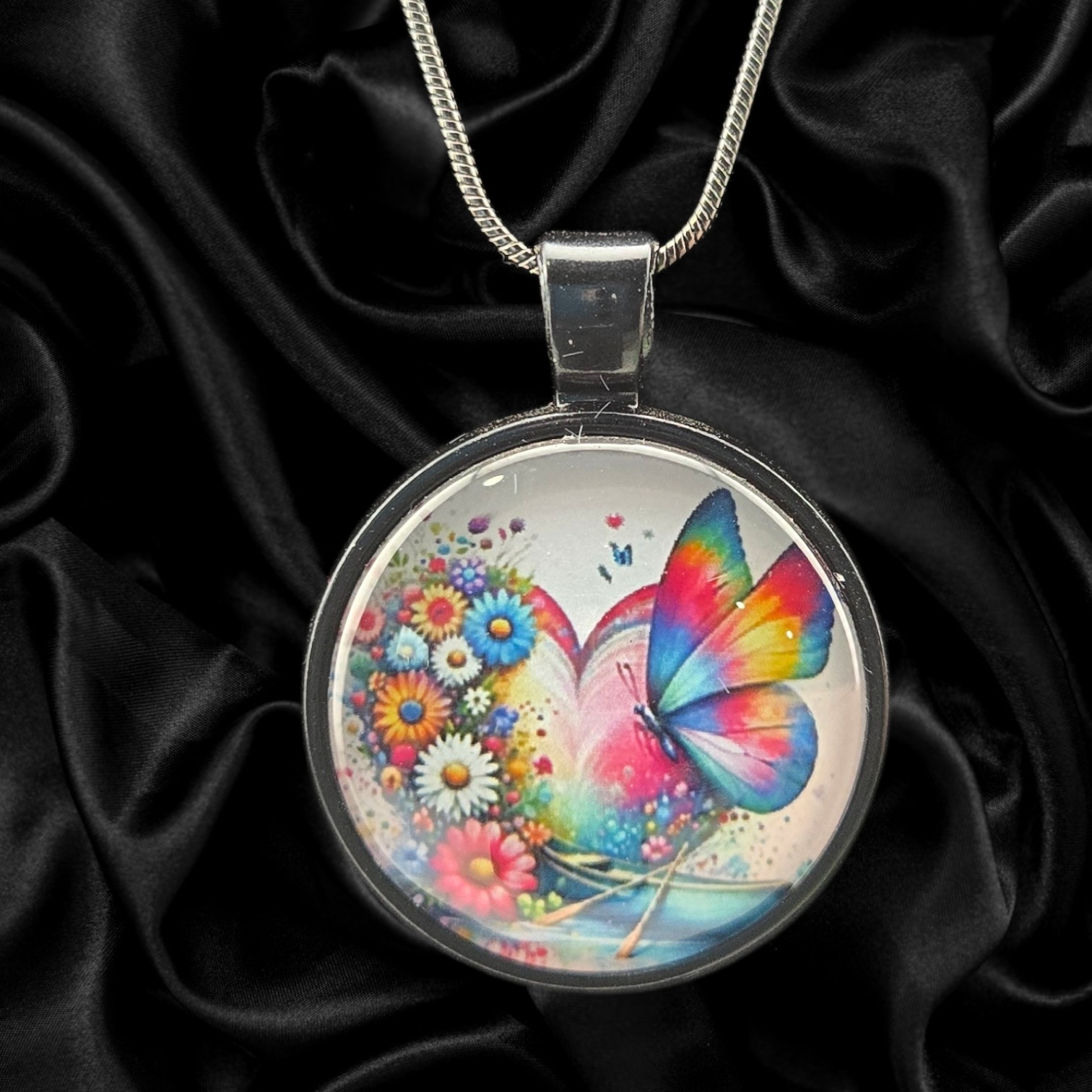 Handmade necklace showcasing a colorful heart filled with flowers and a butterfly in a 1" round charm. Finished with a 1.2mm silver snake chain made from electroplated brass.