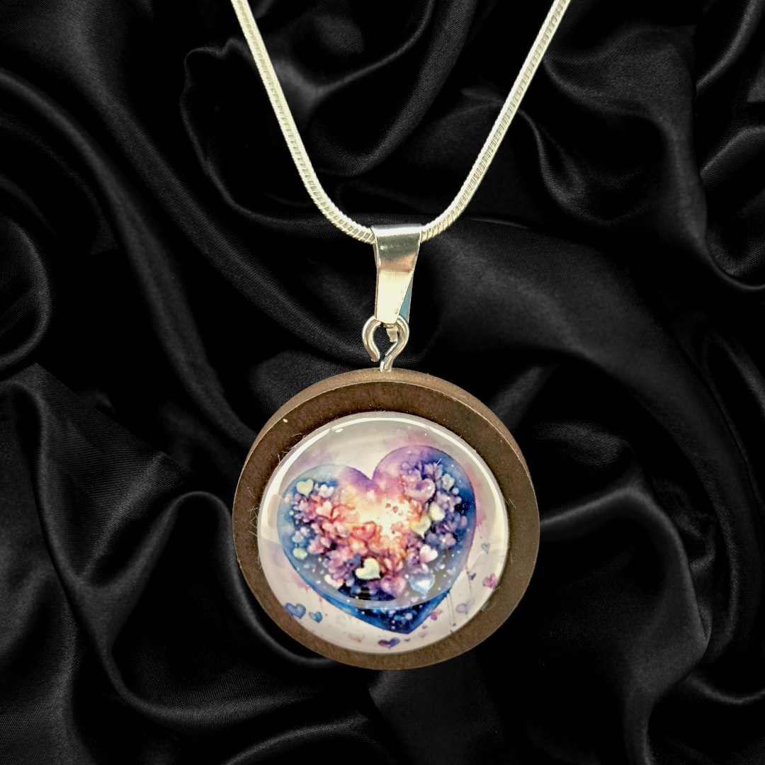 One of a kind round wood pendant necklace featuring a layered heart motif with soft pastel tones and luminous highlights. Pendant measures 3/4 inch round and is paired with a 1.2mm silver snake chain made of electroplated brass.