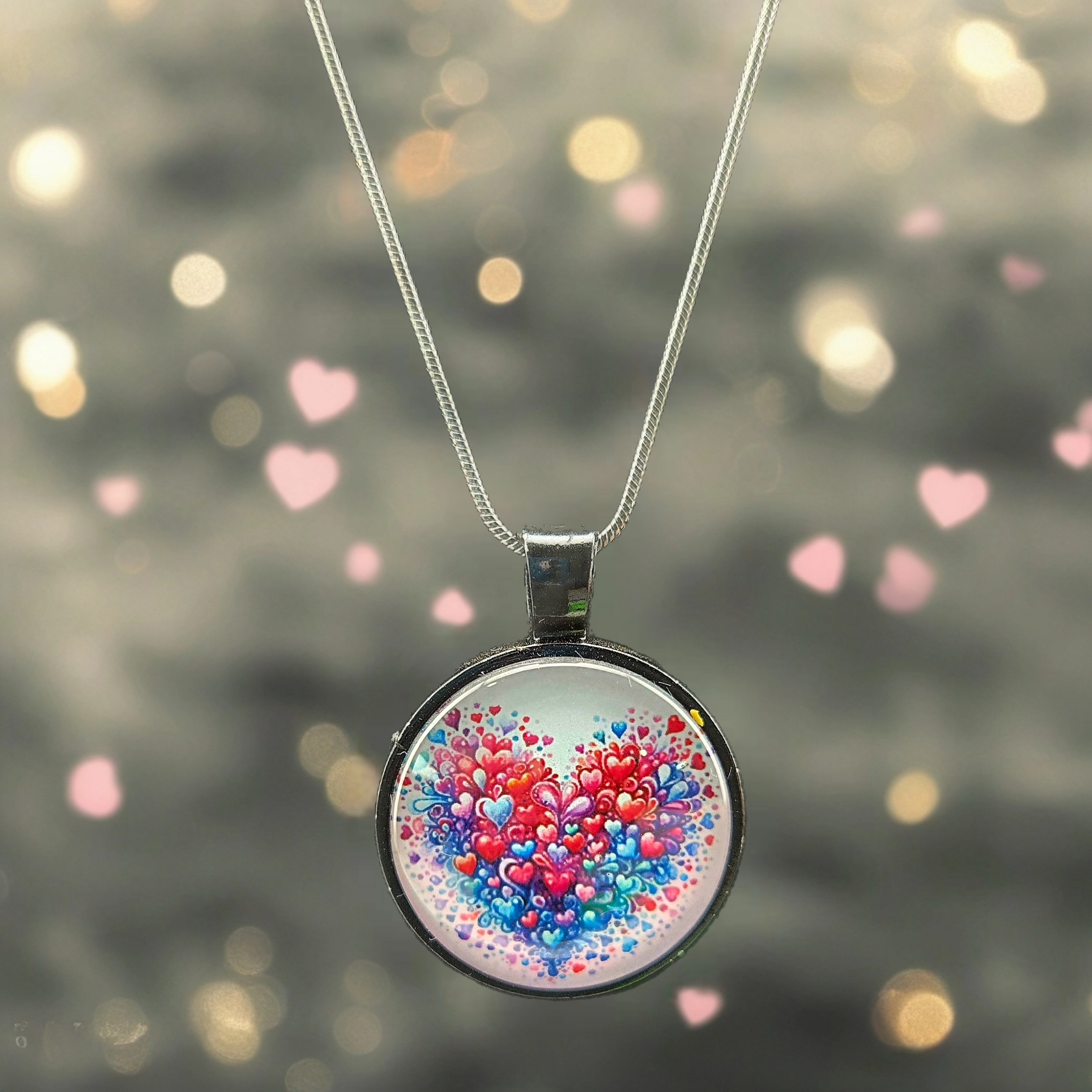 A vibrant heart-filled design encased in a 1-inch round glass charm and paired with a 1.2mm silver snake chain made from electroplated brass. Bright colors and playful detail make this necklace full of joy and warmth.