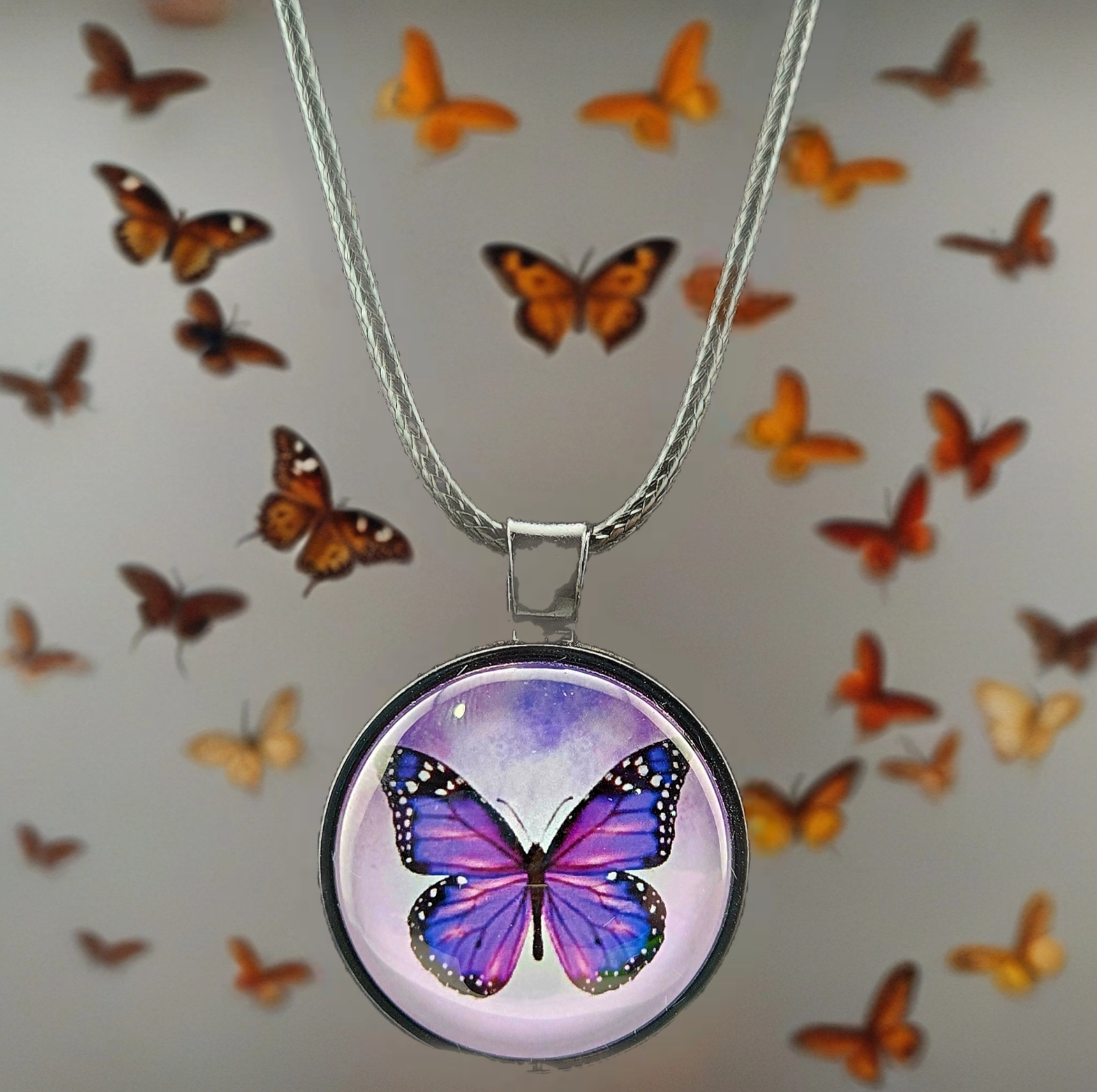 Handmade necklace featuring a purple butterfly design in a 1" round charm. Includes a 1.2mm silver snake chain made from electroplated brass.