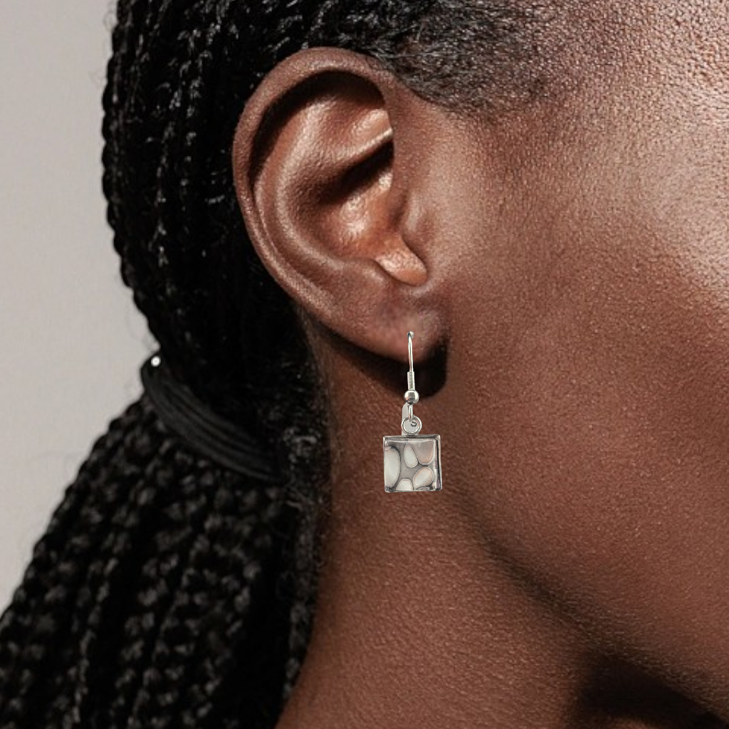 Handmade drop earrings featuring a 10mm square art cabochon with soft neutral tones. Set in a minimalist frame and finished with stainless steel hooks for lightweight, everyday wear.