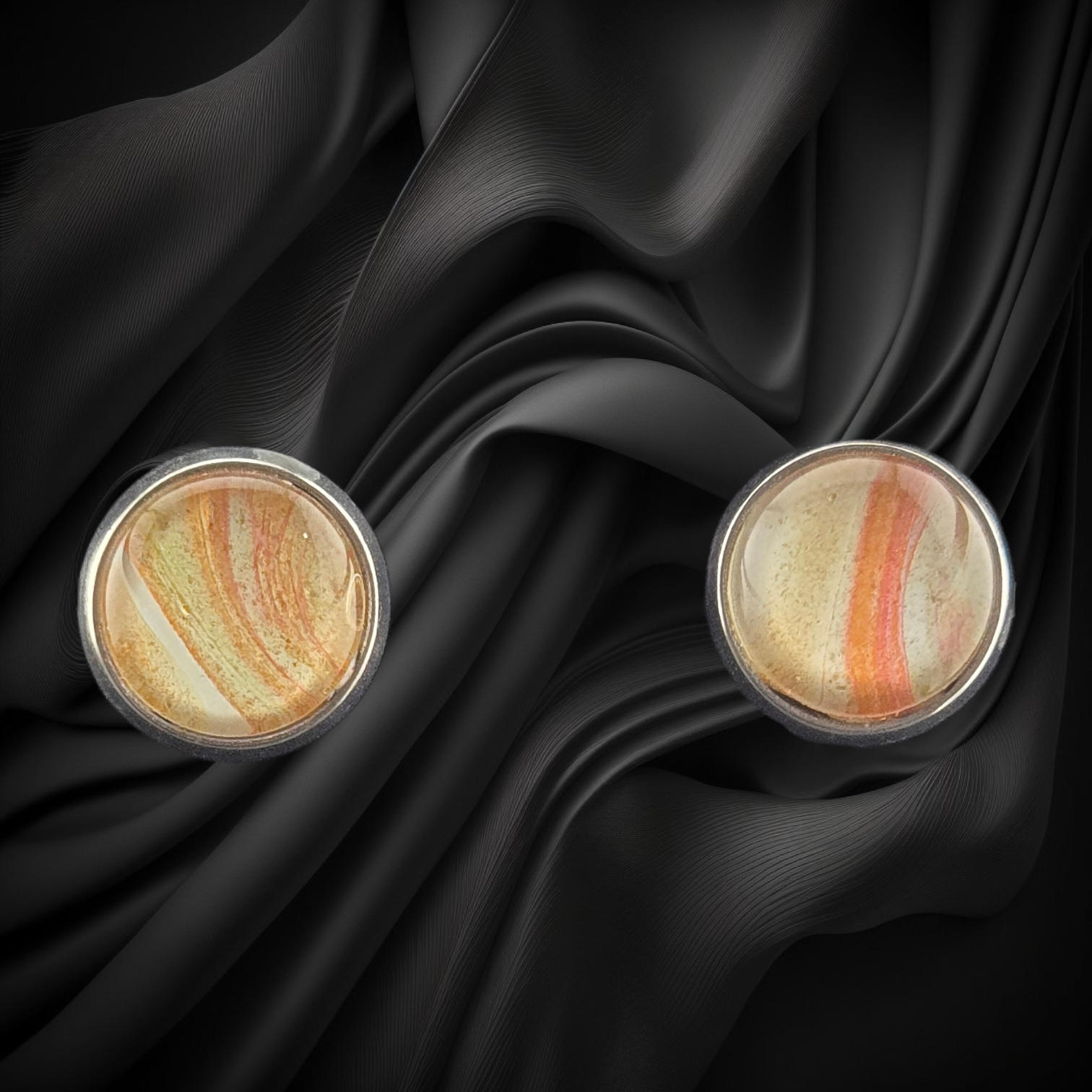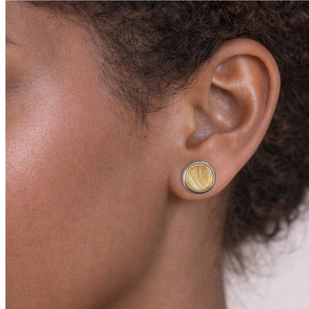 Inspired by deep ocean blues and swirling nebula patterns, these stainless steel stud earrings showcase rich blue tones with hints of white and teal. Measuring 1/2″ across, they are hypoallergenic, durable, and comfortable for all-day wear.