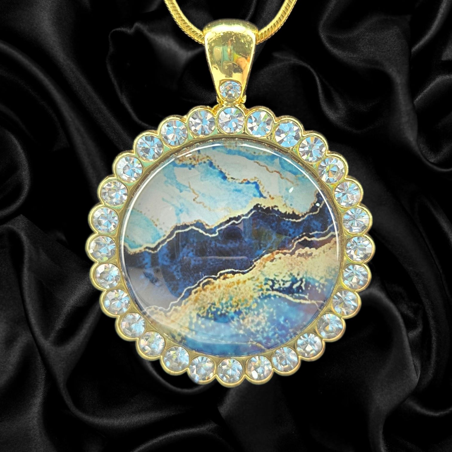 One of a kind 1.5 inch round pendant necklace featuring layered ocean-inspired blues with gold vein accents, framed in a rhinestone bezel. Paired with a 1.2mm gold snake chain made of electroplated brass.