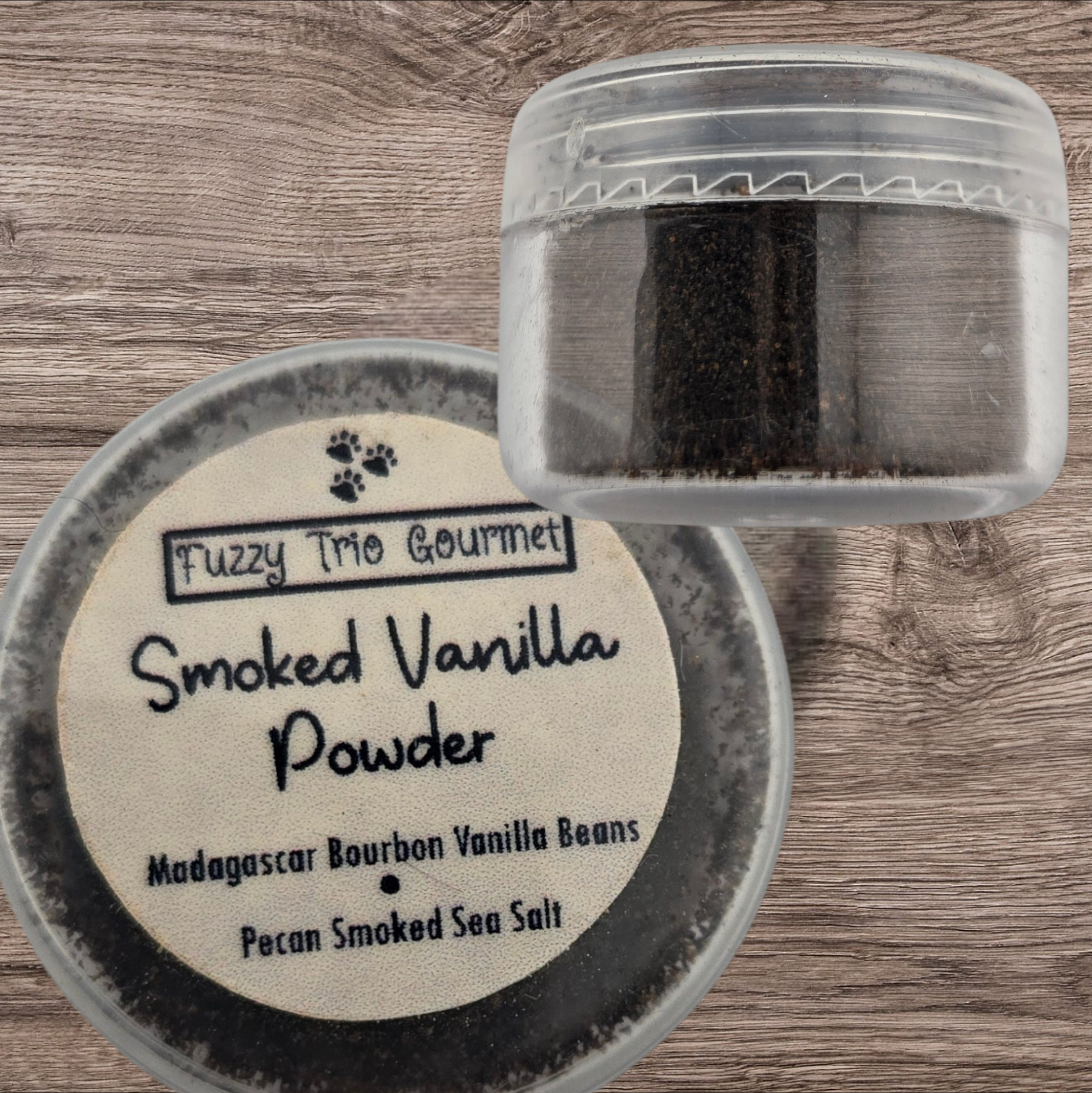 This homemade vanilla bean powder is crafted from Grade A Madagascar Bourbon vanilla beans and gently smoked with pecan wood to add depth and warmth. Finely ground and aromatic, it offers an intense vanilla flavor with subtle smoky notes. 5g