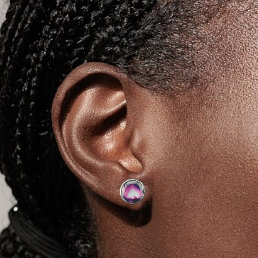 One-of-a-kind 1/2″ round stud earrings featuring soft pink, violet, and white abstract tones. Handmade art set in stainless steel posts.