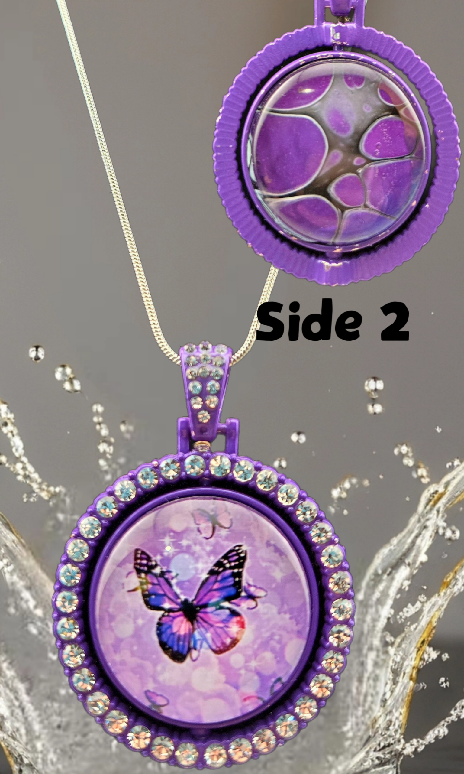 This enchanting double-sided necklace showcases a delicate purple butterfly motif paired with a complementary abstract purple design on the reverse. Encased beneath a clear glass cabochon and surrounded by a rhinestone-studded bezel, the rotating pendant allows you to switch designs effortlessly. A 1.2mm silver snake chain (electroplated brass) completes this whimsical yet polished piece.