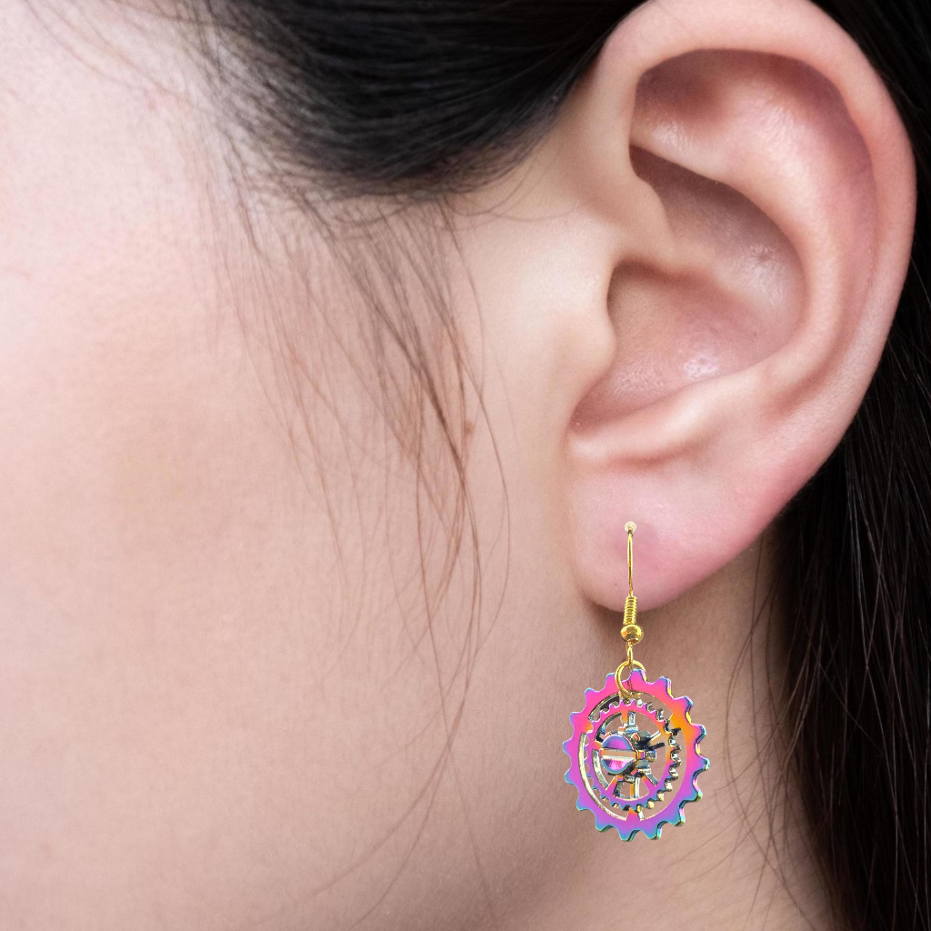Stainless steel hanging earrings featuring iridescent rainbow wagon wheel charms measuring 20mm across. Bold with a metallic shimmer.
