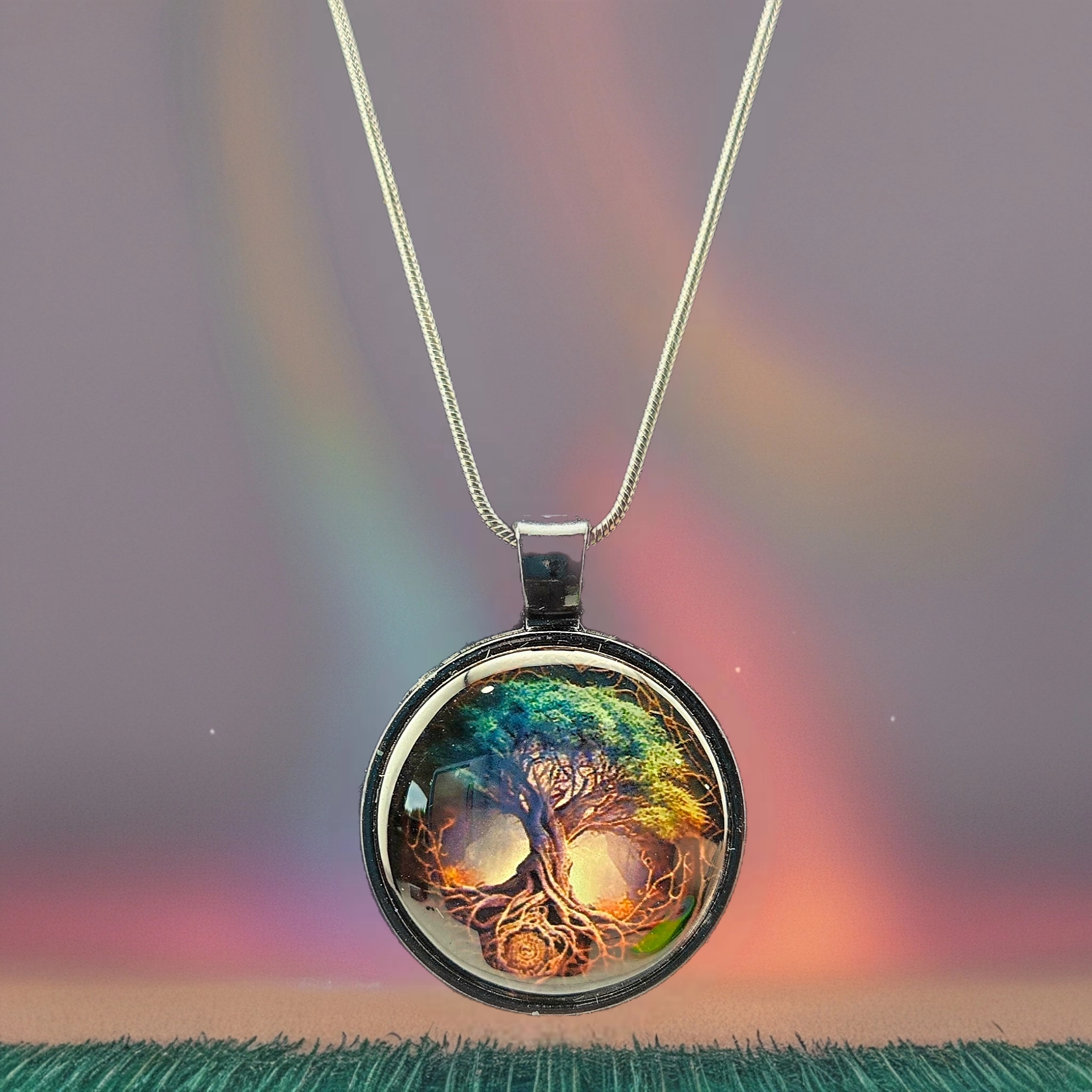 Handmade necklace featuring a glowing tree of life design in a 1" round charm. Includes a 1.2mm silver snake chain made from electroplated brass.
