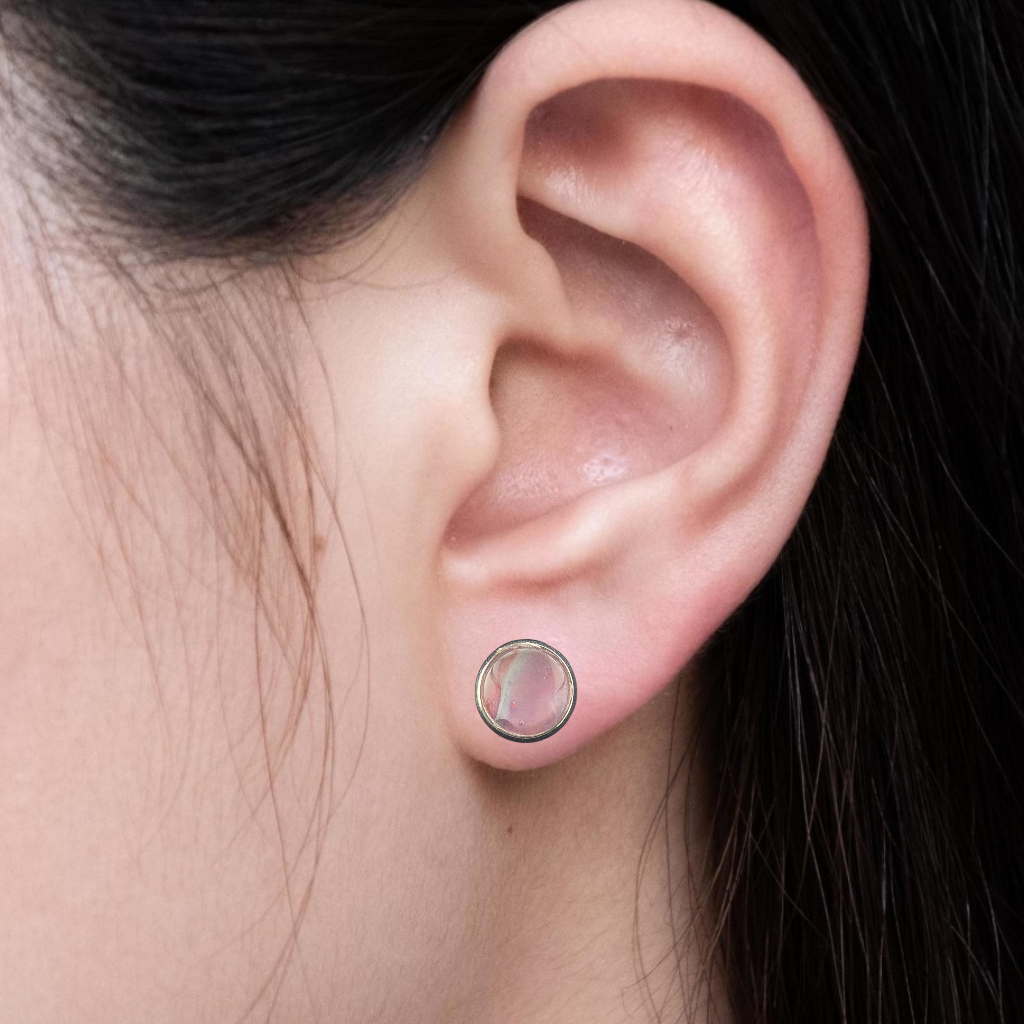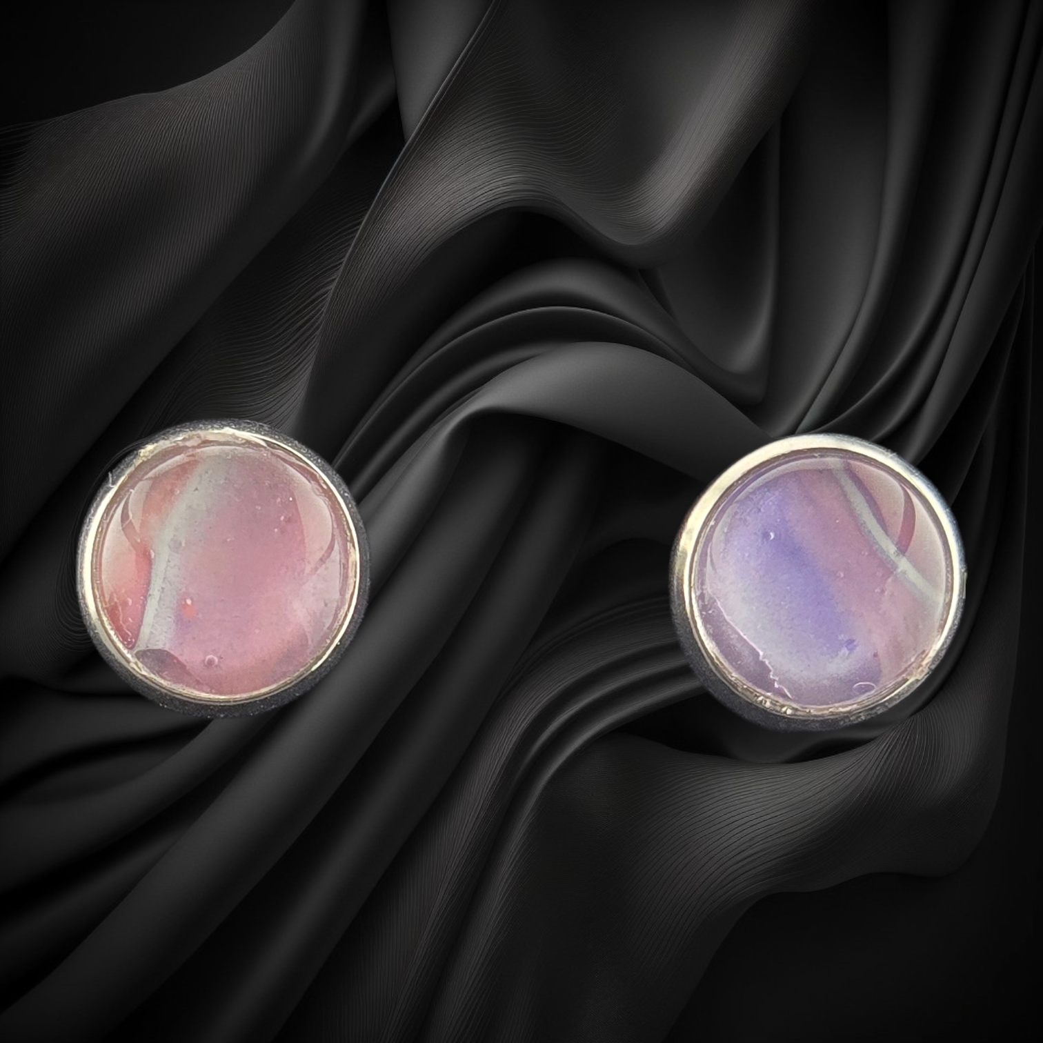 1/2″ round handmade stud earrings with misty rose and mauve tones. Set in stainless steel for everyday wear.