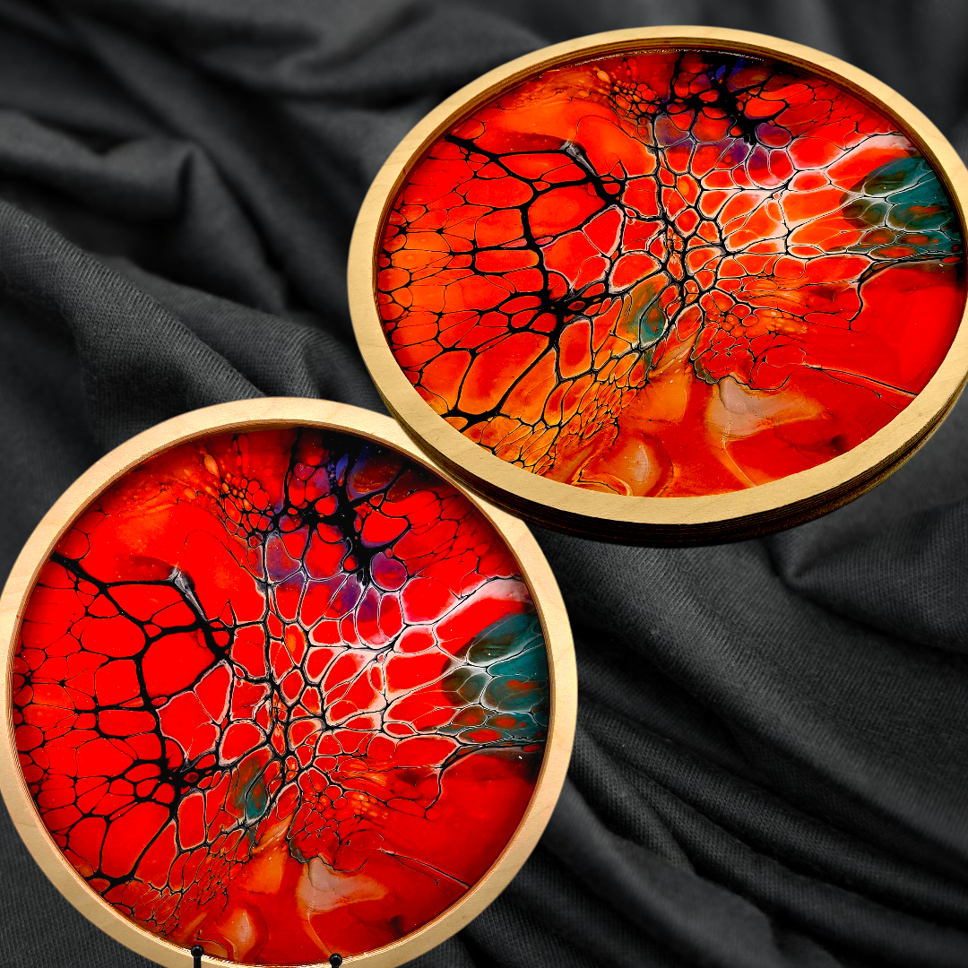 This round tray in a bright orange webbed design is handmade with care and a playful, boho-inspired spirit. Each piece is crafted to feel whimsical and artsy. Only one available. 12" x 1"