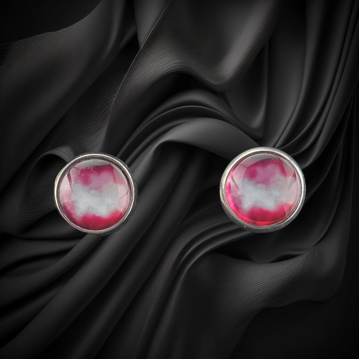 One-of-a-kind ½” stainless steel stud earrings featuring layered ruby red and soft gray abstract artwork sealed under glass. Lightweight, durable, and handcrafted.