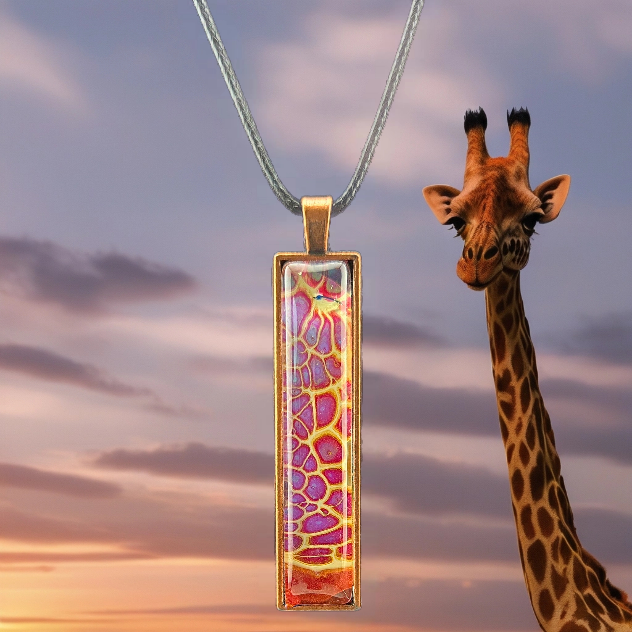 A vibrant 2" vertical bar charm inspired by warm sunset tones and organic patterning. This necklace features a 1.2mm gold snake chain made from electroplated brass, offering a bold yet elegant statement piece.