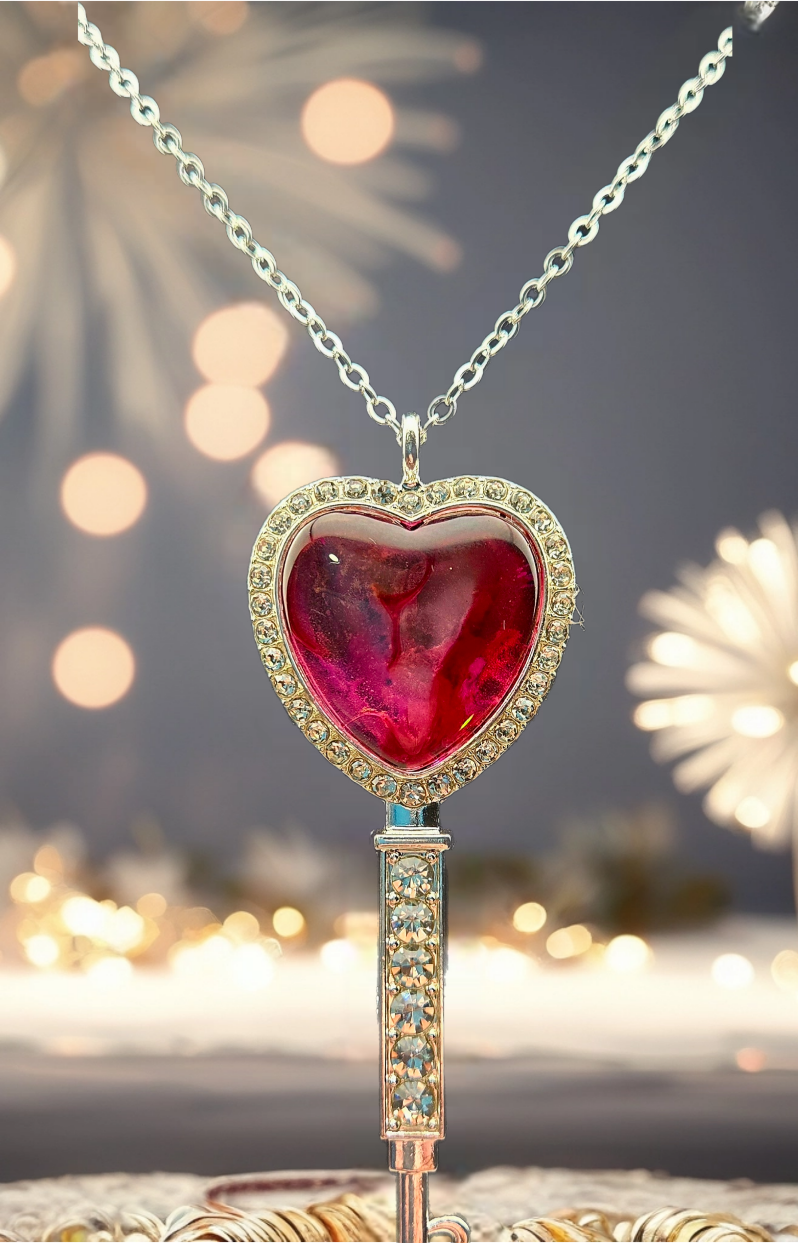 This 3.4" heart key necklace showcases a heart-shaped cabochon with deep red abstract patterns, set in a silver-colored rhinestone-accented key pendant. Rich and romantic, this design represents love, passion, and emotional strength. Includes a 20" silver chain (electroplated brass).