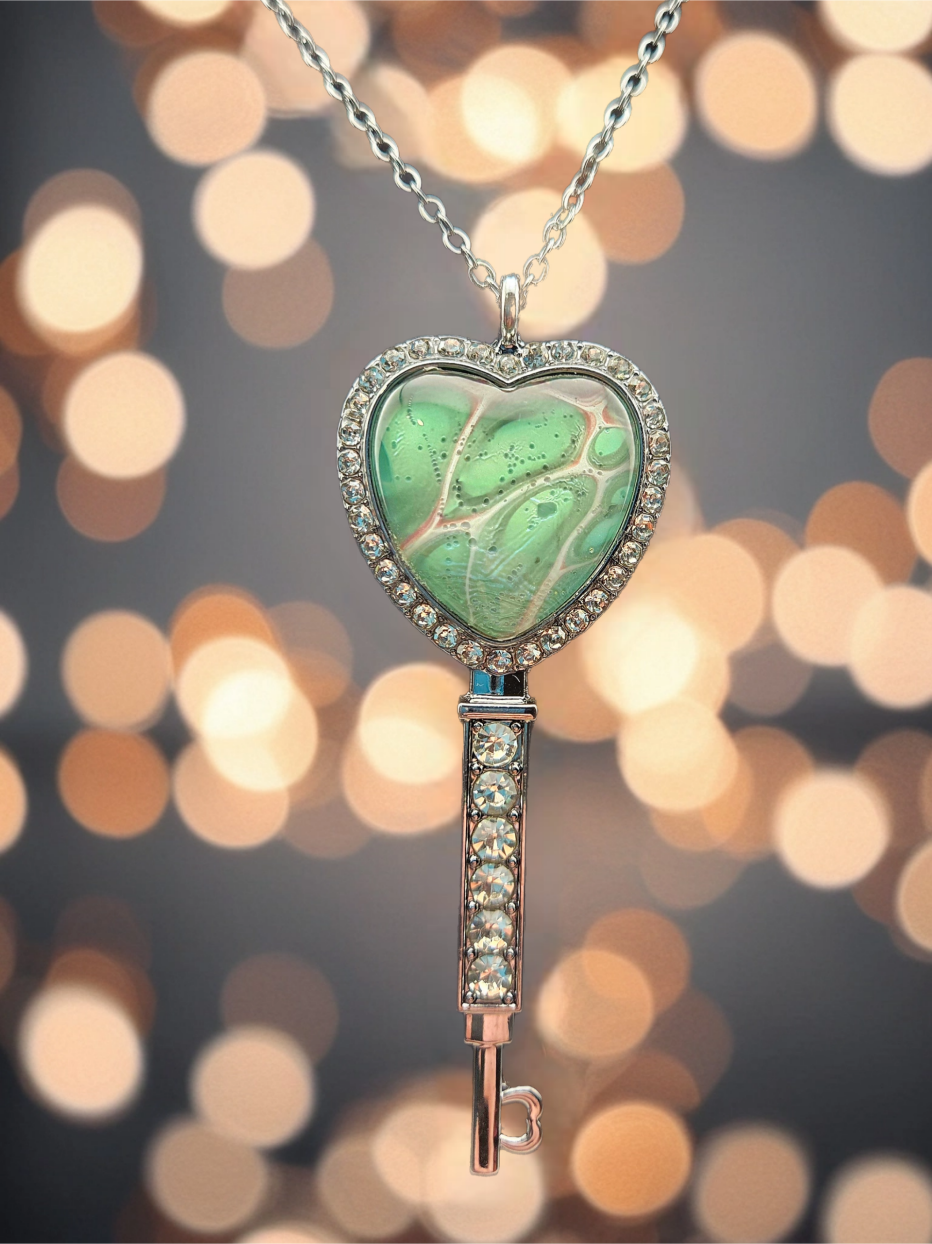 This 3.4" heart key necklace features a heart-shaped cabochon in soft green abstract tones, paired with a silver-colored rhinestone key pendant. Calm and soothing, this design symbolizes renewal, balance, and gentle transformation. Includes a 20" silver chain (electroplated brass).