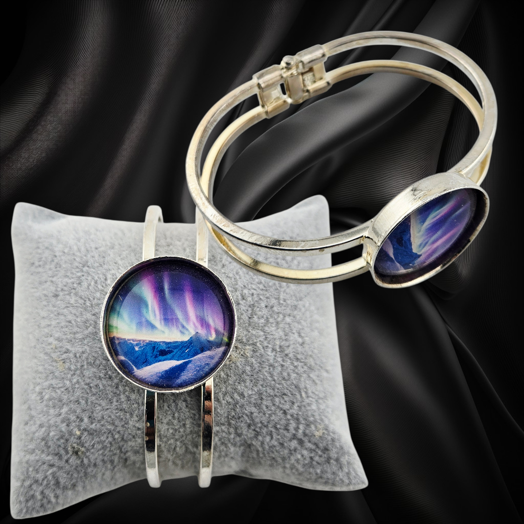 This silvery bangle northern lights is handmade with care and a playful, boho-inspired spirit. Each piece is crafted to feel whimsical and artsy. Only one available. 2.44" diameter.