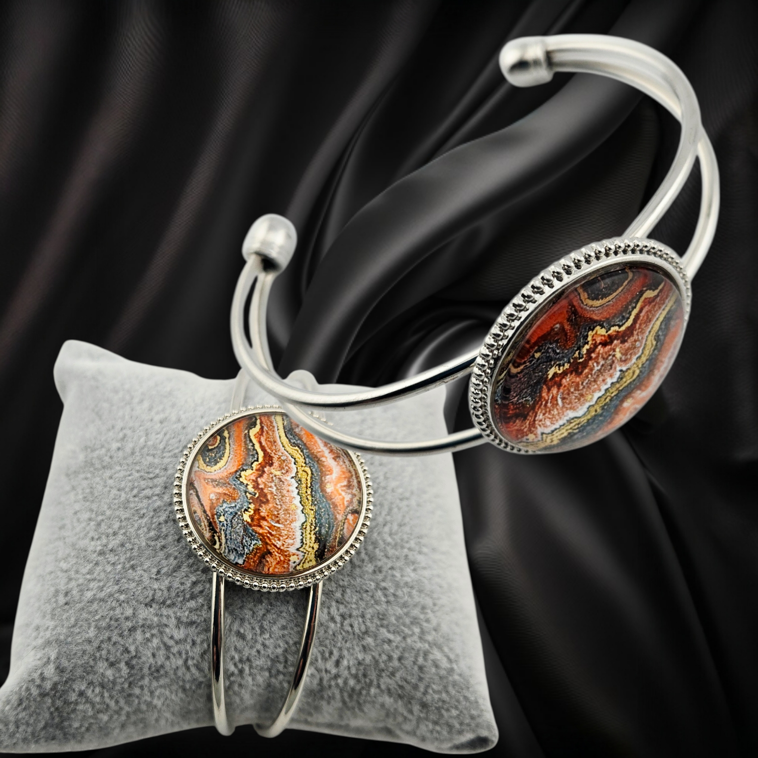 This silvery cuff warm colors is handmade with care and a playful, boho-inspired spirit. Each piece is crafted to feel whimsical and artsy. Only one available. 2.2"-2.8" diameter.