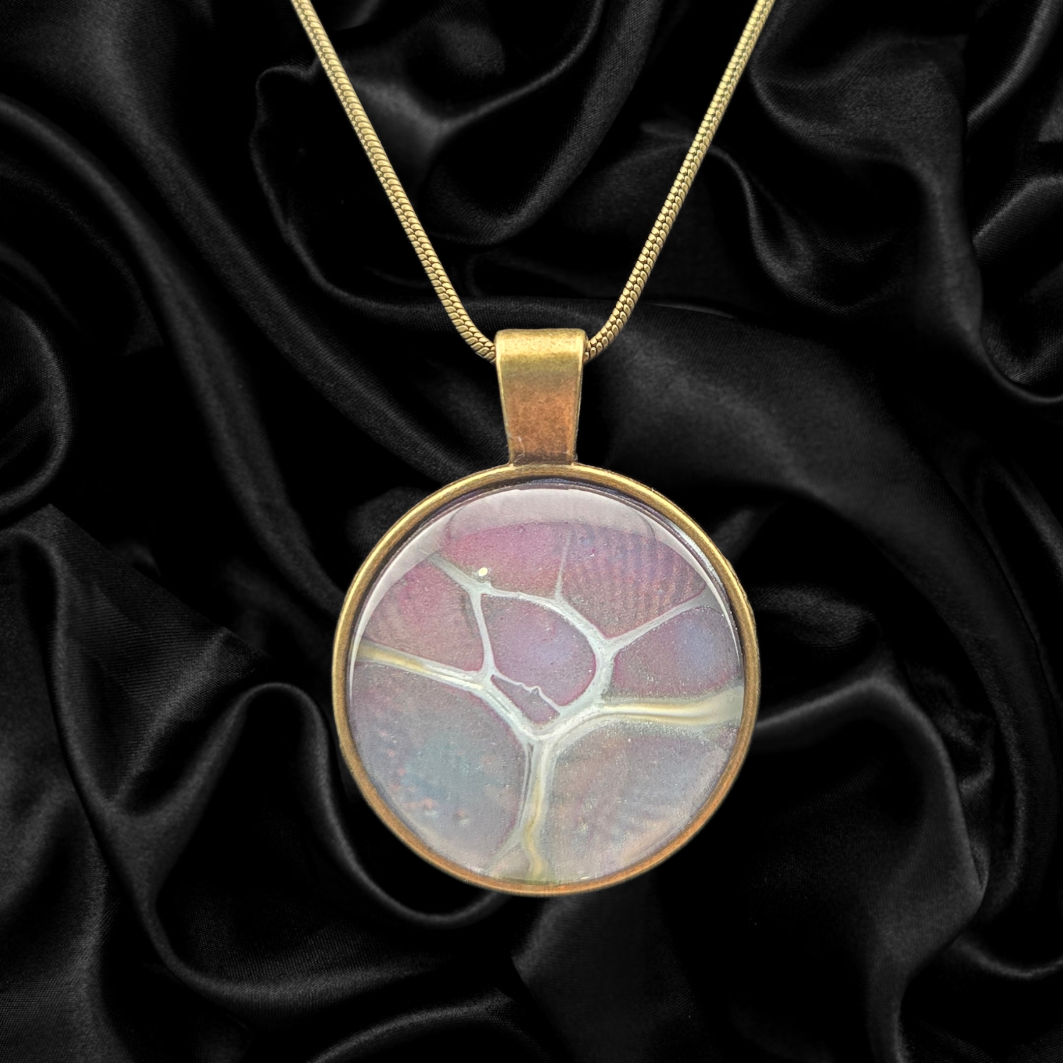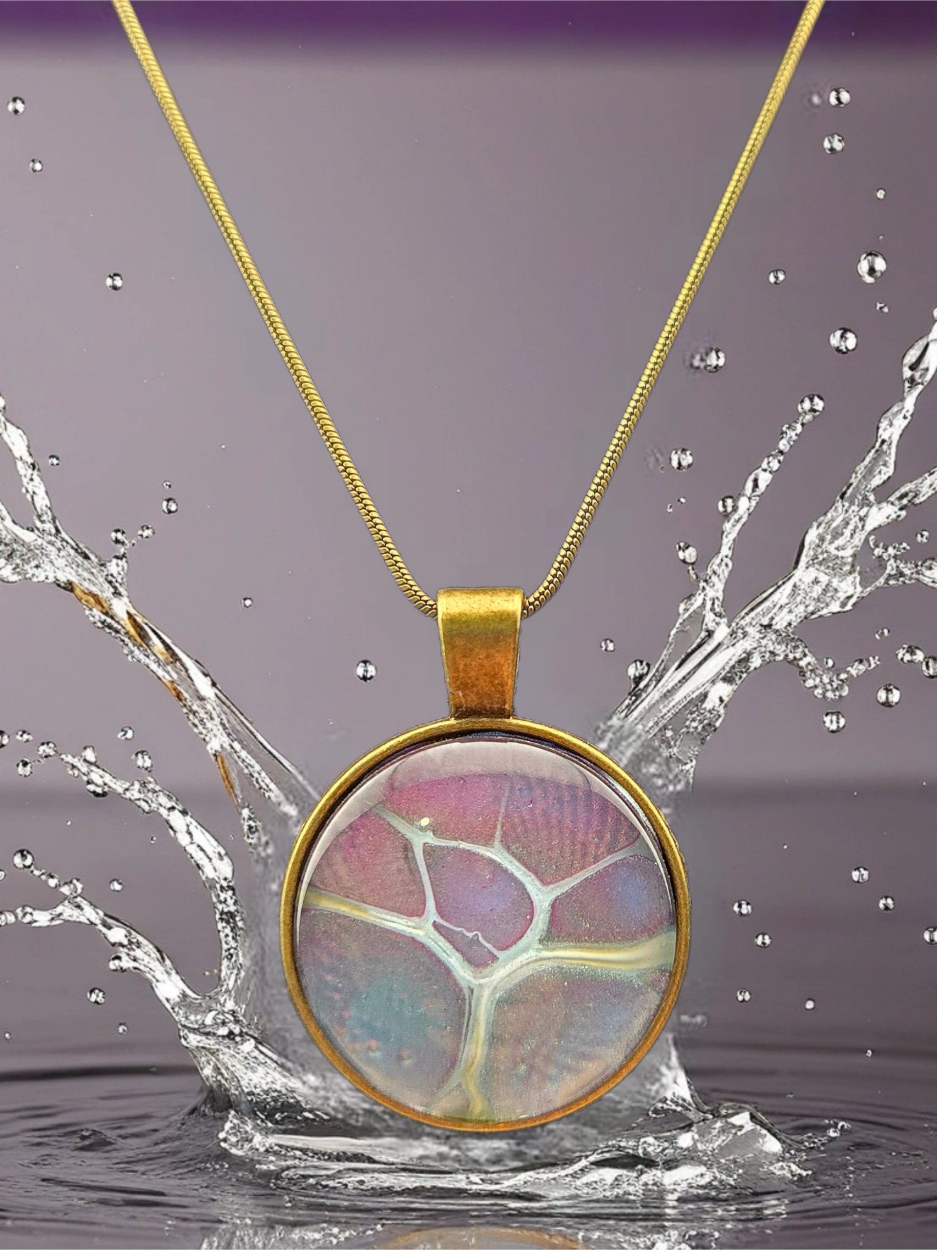 This 1" round necklace highlights a soft abstract design with flowing, cell-like lines in muted pastel tones. The smooth cabochon finish gives the artwork depth while the gold-tone bezel adds warmth and balance.