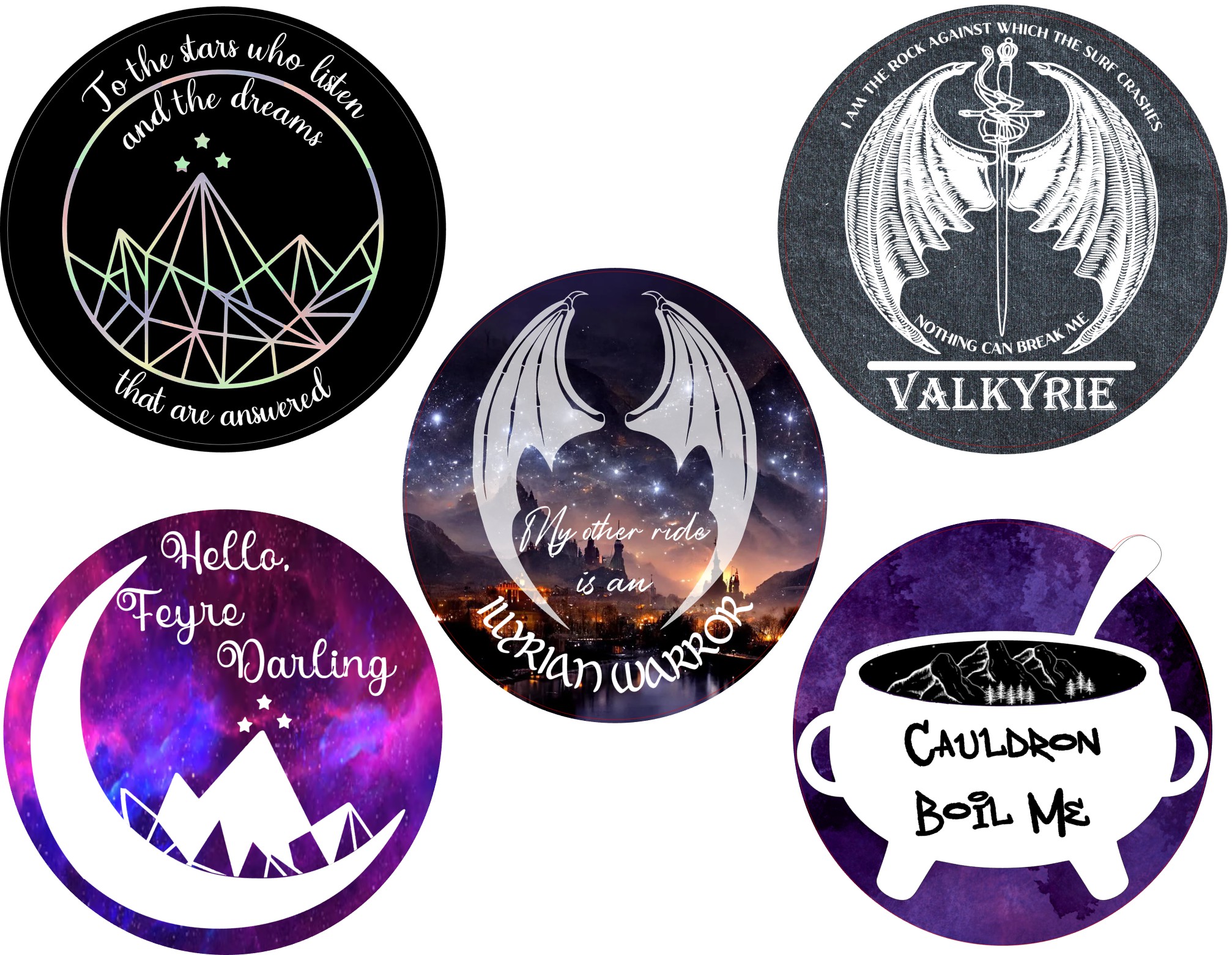 Step into Prythian with this ACOTAR-inspired sticker collection, featuring celestial quotes, magical symbols, and cozy fantasy vibes for readers who live for wings, stars, and found family. Each design is inspired by the world of A Court of Thorns and Roses and created to celebrate resilience, magic, and a little bit of sass.