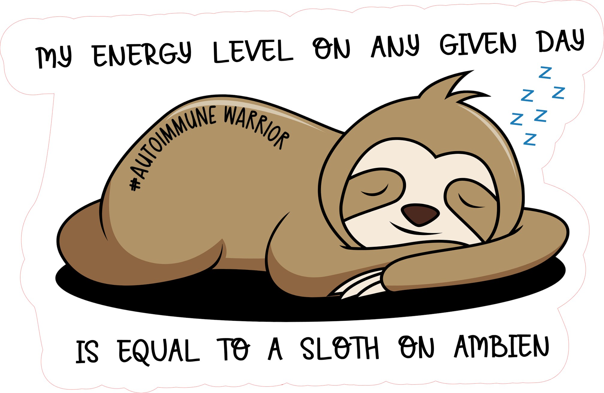 Featuring an adorably exhausted sloth and the phrase “My energy level on any given day is equal to a sloth on Ambien,” this design is a relatable nod to life with chronic illness, autoimmune conditions, fatigue, and spoonie culture.