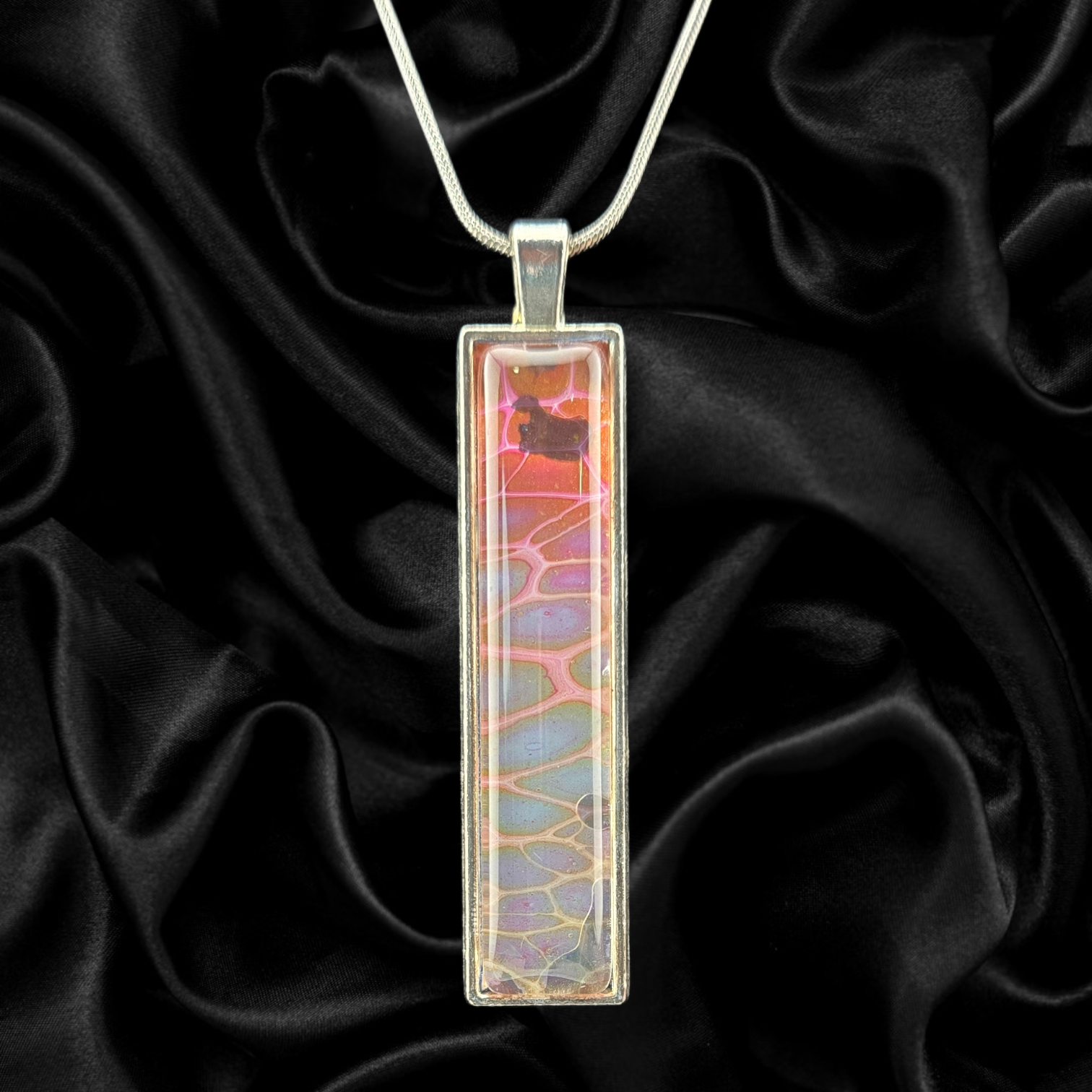 A vibrant 2" vertical bar charm inspired by sunset hues, set beneath glass and paired with a 1.2mm silver snake chain made from electroplated brass. This modern piece features a sleek silhouette with radiant color movement.