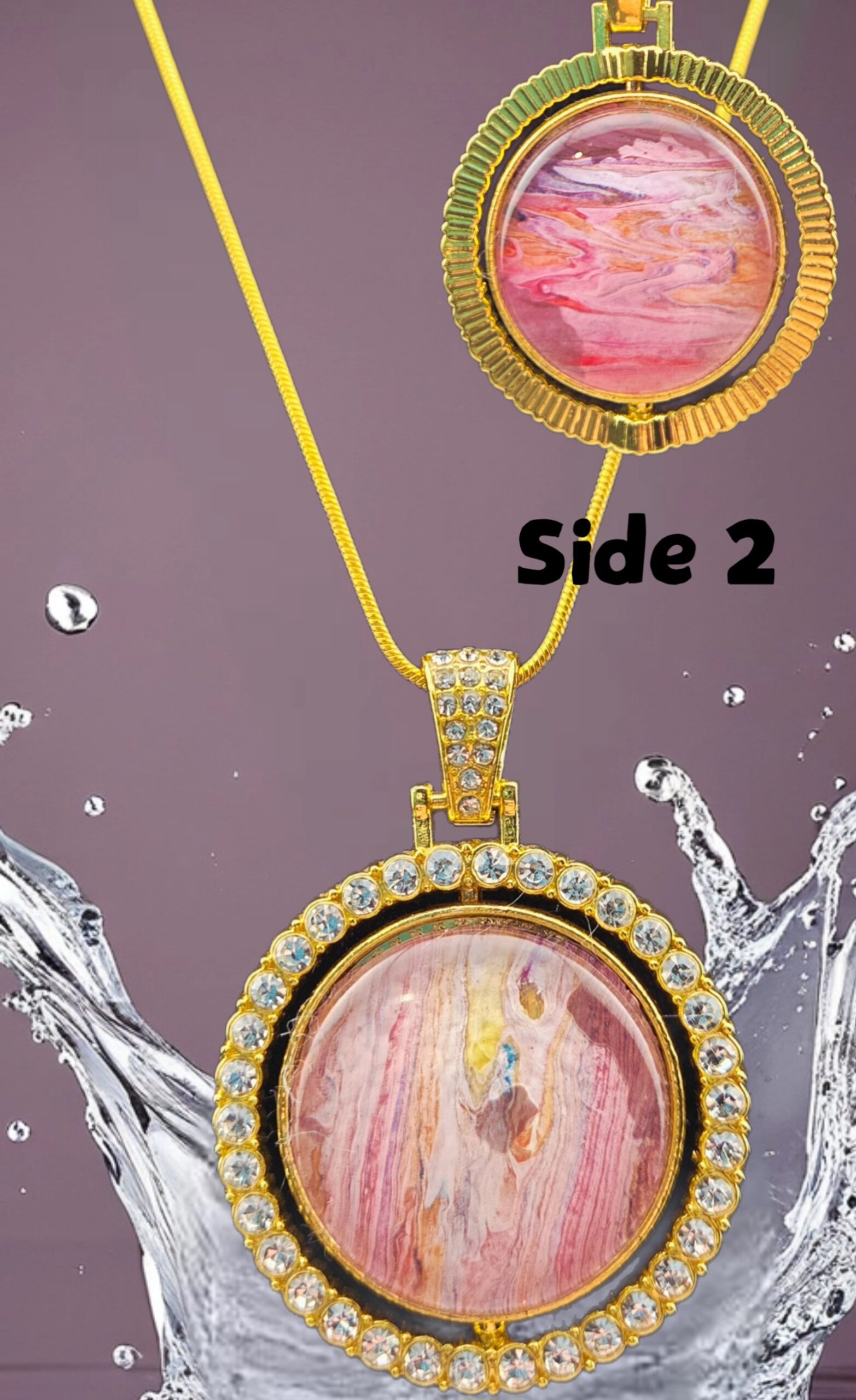 Warm, glowing color in motion. This double-sided rotating necklace features two coordinating abstract designs in sunset tones (peach, coral, and soft pink), sealed beneath a clear glass cabochon and framed by a bright rhinestone bezel. The gold-tone metal alloy pendant hangs on a sleek 1.2mm gold tone snake chain (electroplated brass).