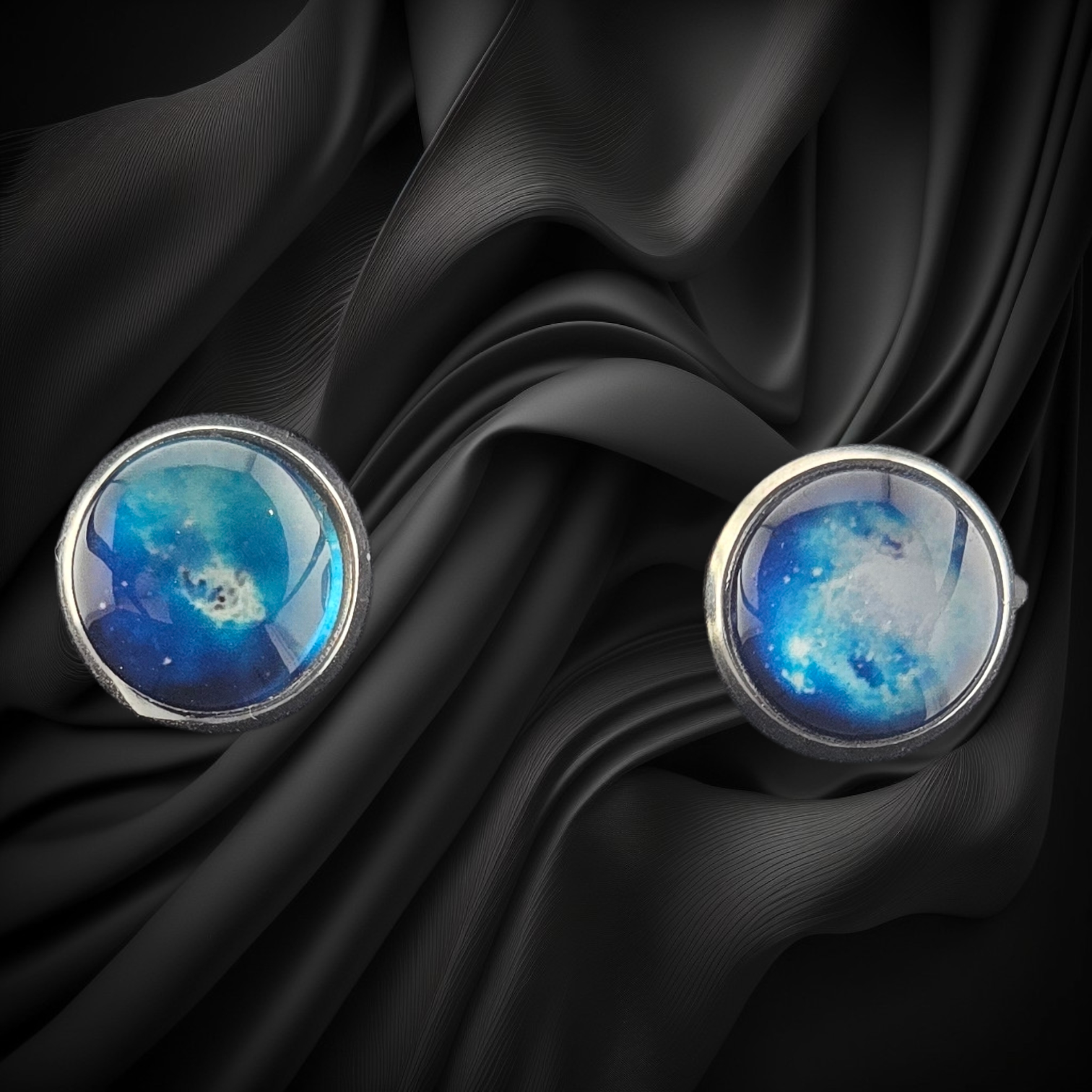 These stainless steel stud earrings feature a swirling vortex design with layered blues, teals, and soft neutrals reminiscent of ocean currents. At 1/2″ across, they are lightweight, hypoallergenic, and perfect for daily wear.