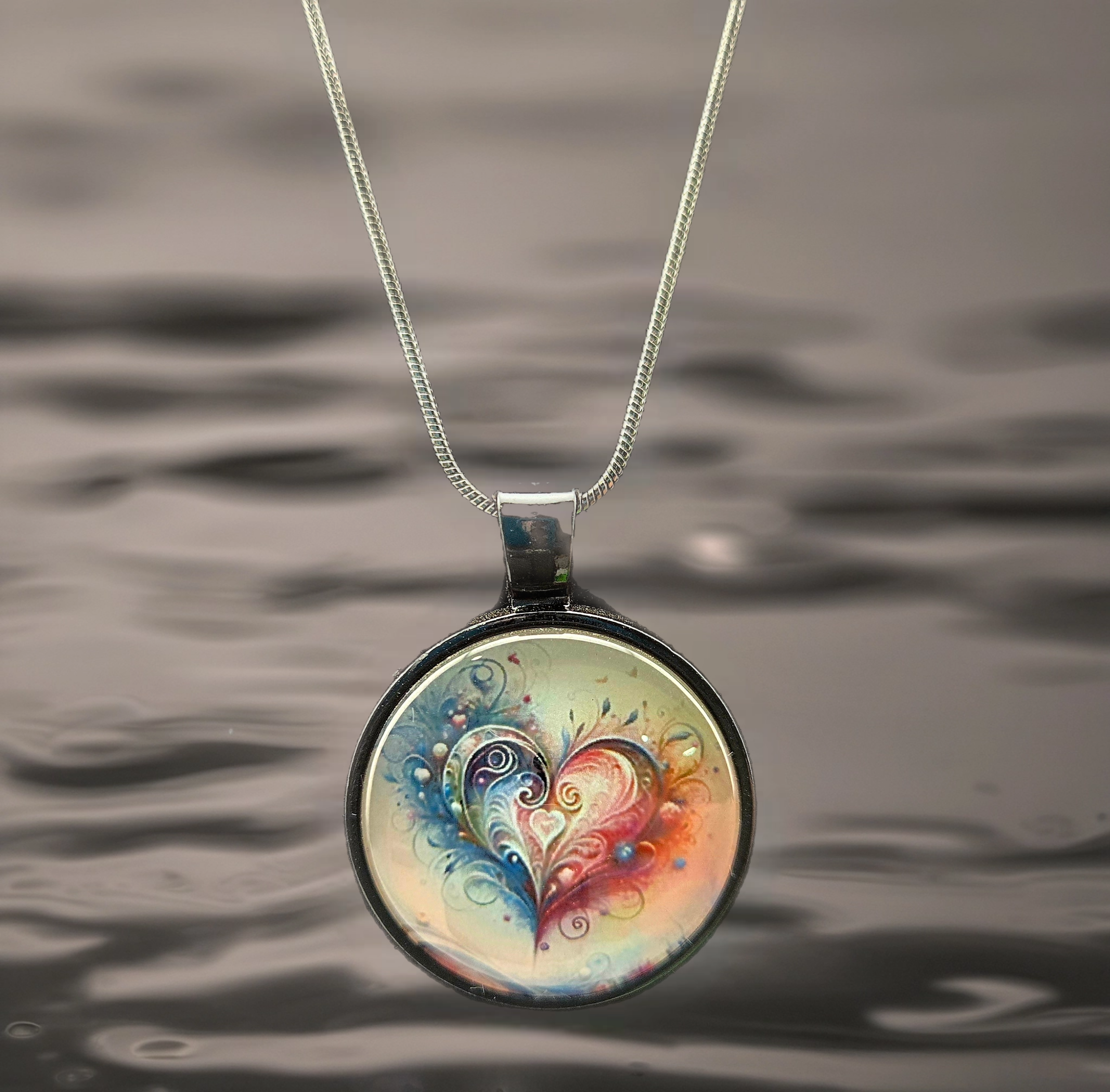 Handmade necklace featuring a multicolor swirling heart design in a 1" round charm. Includes a 1.2mm silver snake chain made from electroplated brass.