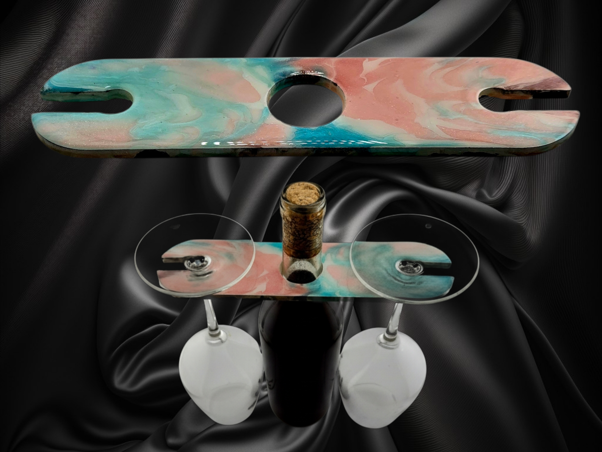 This wine caddy in a light blue and pink color palette is handmade with care and a playful, boho-inspired spirit. Each piece is crafted to feel whimsical and artsy. Only one available. 8.5" x 2.25"