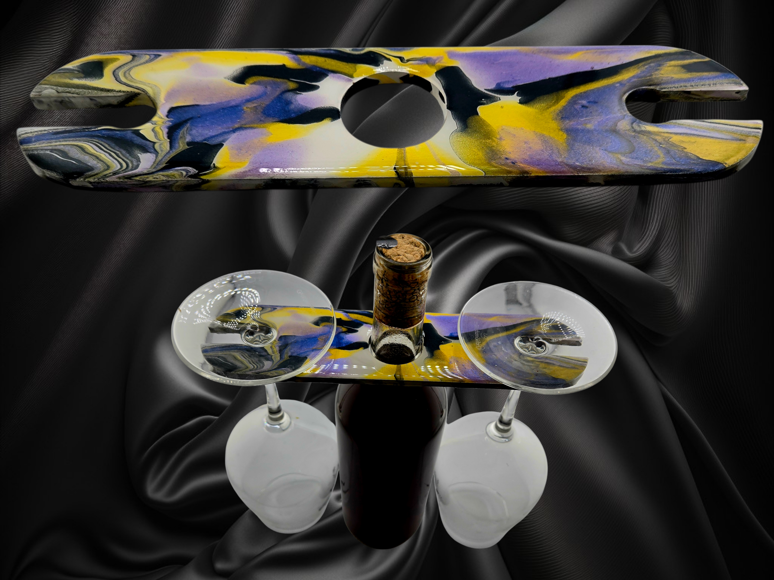 This wine caddy in a lively yellow, purple, and black palette is handmade with care and a playful, boho-inspired spirit. Each piece is crafted to feel whimsical and artsy. Only one available. 8.5" x 2.25"